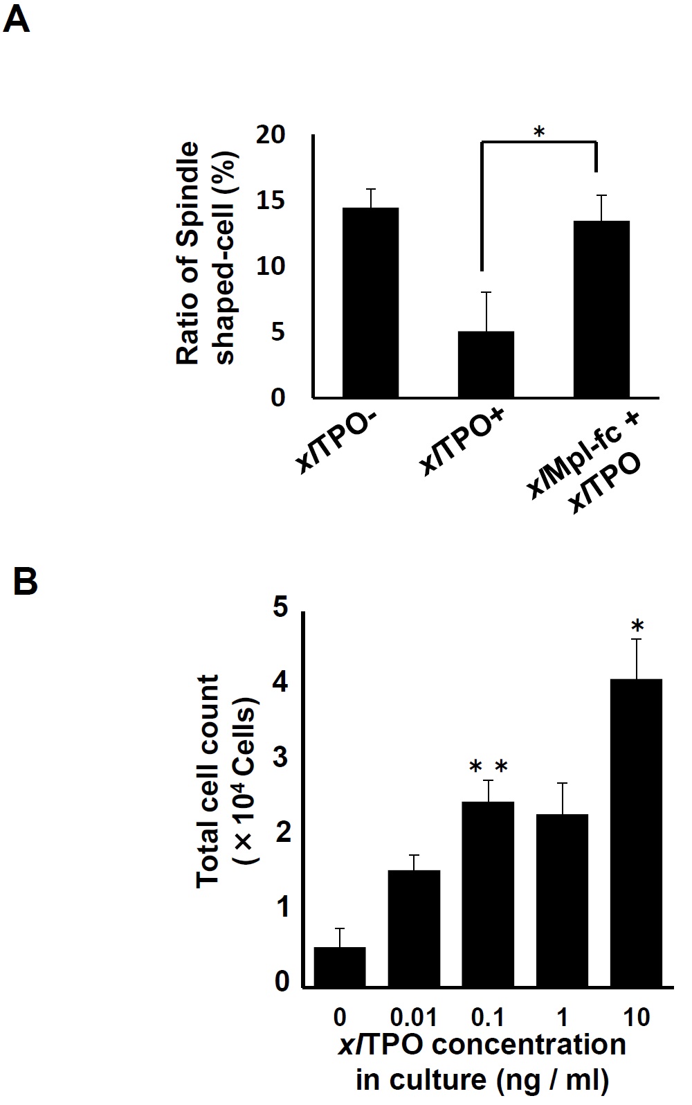 Supplementary Figure 5. Proliferation of UT-7/TPO cells after xlTPO stimulation. (A) MTS assay of UT-7/TPO cells. UT-7/TPO cells were stimulated with xlTPO or hTPOfor 72 h in 96-well plates and analyzed by MTS assay. Controls were the UT-7/TPO cells cultured in the absence of TPO for 72 h. *P < 0.05 vs. the control. (B) Cell morphology of UT-7/TPO cells. UT-7/TPO cells were stimulated with xlTPO or hTPOfor 72 h. (C) JAK2 phosphorylation. UT-7/TPO cells were cultured overnight in the absence of serum and growth factor in IMDM. Cells were stimulated with xlTPO or hTPOfor 5 min and phosphorylated JAK2 was measured by western blotting. |