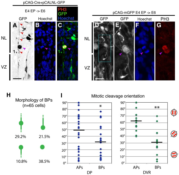 Fig. 2. Radial glial morphology of chicken basal mitotic cells. (A-G) Visualization of basal mitotic cells in the developing chicken pallium with the pCALNL-GFP vector (A-C) or a membrane-bound GFP vector (D-G). Electroporation was performed at E4 and samples were collected at E6. Note that PH3+ basal mitotic cells (purple arrow) extended radial fibers toward both the basal and apical sides of the brain (red arrowheads in A). (D-G) Oblique cleavage plane of basal mitotic cells. (H) Classification of basal mitotic cells based on the presence of apical and/or basal radial fibers. (I) Quantification of the cleavage plane angle relative to the ventricular surface in APs and BPs. Bars indicate mean. *P<0.05, **P<0.01; Student's t-test. NL, neuronal layer; VZ, ventricular zone. Scale bars: 10 µm in A (for A-C), D (for D-G).