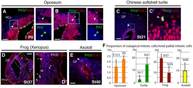Fig. 4. Comparative analysis of basal mitotic cells in various tetrapod species. (A,B) Distribution of PH3+ cells in the developing opossum cortex (M. domestica, P1). PH3+ basal mitotic cells (arrowheads) expressed Pax6 (A) or Sox2 (B). (C,Câ²) A PH3+ basal mitotic cell (arrowhead) was Sox2+ in the developing turtle cortex. (D,E) Distribution of PH3+ cells in developing Xenopus (D,Dâ²) and axolotl (E). Arrowheads indicate in green (Dâ²) indicate PH3+ cells at the ventricular surface; arrowheads in yellow (D,Dâ²) and white (E) indicate PH3+ cells at the basal side of the ventricular zone. (F) The proportion of basal mitotic cells among all pallial mitotic cells in various tetrapods. Mean±range (opposum, turtle, axolotl) or mean±s.d. (Xenopus). Scale bars: 100â µm in A,C,D; 50â µm in B,E.