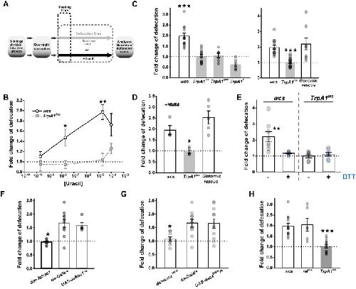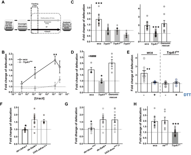 Fig 1. TRPA1 regulates defecation in response to the uracil-triggered Duox pathway.A Schematic diagram illustrating the uracil-dependent defecation assay (see Materials and Methods for details). B Dose-dependence of uracil-responsive defecation in wild type flies (wcs) versus TrpA1ins (n = 4–13). Sucrose solution containing uracil at 0.2, 20, 20,000 and 100,000 nM was fed to the indicated genotypes, and the defecation was compared with that from sucrose-only-fed flies. C Requirement of TrpA1 for uracil-induced defecation was confirmed with three independent TrpA1 alleles (n = 6–13). Fold change of defecation was acquired by comparing defecation frequencies from two sibling groups fed with or without 20 μM uracil. Right: The defecation defect in TrpA1ins was rescued by the WT TrpA1 gene inserted in the fly genome. D Ingestion of electrophile N-methyl maleimide (NMM) promotes defecation depending on TrpA1 (n = 4–5), indicating that reactive chemicals in the gut lumen can induce defecation increases through TrpA1. E Co-ingestion of ROS-counteracting dithiothreitol (DTT) with uracil abolishes the defecation increase that is dependent on TrpA1 (n = 6–8). See also S2E–S2G Fig. F Ubiquitous expression of a peroxiredoxin gene Jafrac1