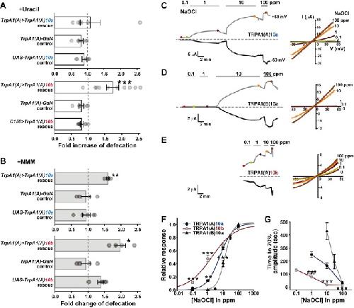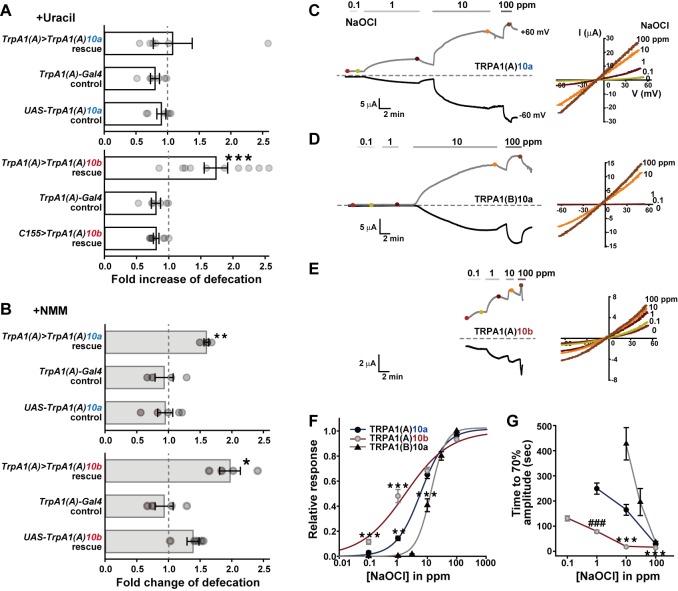 Fig 3. The TRPA1(A)10b isoform is the HOCl receptor essential for uracil-evoked defecation.A Rescue of the defect in uracil-dependent defecation of TrpA1ins animals by expressing TrpA1(A) cDNA with either exon10a (TrpA1(A)10a) or exon10b (TrpA1(A)10b) in TrpA1(A)-Gal4 cells (n = 6–10). Expression of TrpA1(A)10b by EEC-expressing TrpA1(A)-Gal4 but not pan-neuronal c155-Gal4 restored uracil-dependent defecation in the TrpA1ins animal (Lower), while TrpA1(A)10a expression in TrpA1(A)-Gal4 EECs did not (Upper). B Rescue of the defect in NMM-dependent defecation of TrpA1ins mutants by the two alternative TrpA1(A) isoforms (n = 4–5). The NMM-mediated defecation was rescued by expressing TRPA1(A)10a in TrpA1(A)-Gal4 EEC cells, although uracil-dependent defecation was not. C-E Representative dose dependence (Left) and current-voltage relationship (Right) of NaOCl responses in Xenopus oocytes heterologously expressing indicated isoforms. Note that the time scales and dose sequences are set identical for simple comparison of activation kinetics. F Normalized dose dependences of TRPA1 isoforms averaged from the results at -60 mV in C-E panels (n = 4–10). TRPA1(A)10b show more sensitive response to NaOCl than TRPA1(A)10a or TRPA1(B). Current amplitudes at varying doses of NaOCl was normalized with respect to that at 100 ppm. The data were fitted to Hill equation to determine EC50s. G Time to 70% of the steady state current amplitude induced at each NaOCl concentration was measured for indicated TRPA1 isoforms for activation kinetics comparison of macroscopic NaOCl currents (n = 5–9, -60 mV). Mean ± SEM shown. *: p<0.05, **: p<0.01, ***: p<0.001, Tukey test. ###: p<0.001, Student’s t-test. See also S9 Fig for further functional characterization data of fly and human TRPA1s in oocytes, and for HOCl- or NMM-elicited action potential responses in sugar cells ectopically expressing fly TRPA1 isoforms.