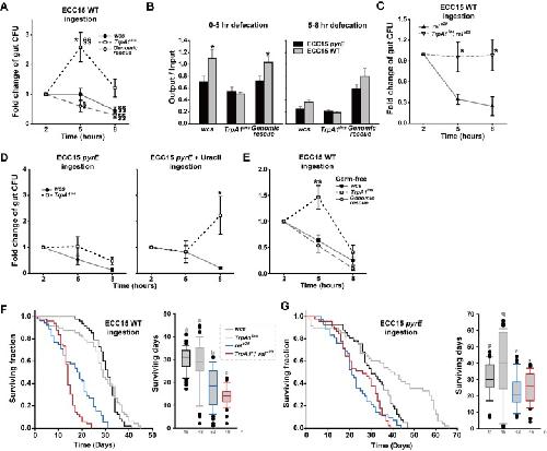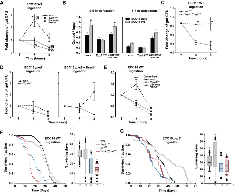 Fig 5. Defecation deficit in TrpA1 mutants is associated with longer ECC15 gut persistence and rel-dependent increased mortality.A Gut persistence presented as relative colony-forming units (CFUs) at 2-, 5- and 8-hr time points of the experiments (n = 6–12). The time point indicates the time after start of ECC15 feeding. After ingestion of ECC15-GFP for indicated time, the dissected intestine was homogenized and CFUs of intestinal ECC15-GFP were determined to estimate bacterial growth in the gut. CFUs at 5 and 8 hr time points were divided by that at 2 hr time point to minimize experimental variation. B Defecation in the assay time windows of 0–5 hrs and 5–8 hrs is displayed as output/input (n = 5–17). Consistent with (A), TrpA1-dependent defecation is more prominent between 0 and 5 hr time points. C Loss of TrpA1 increases ECC15 gut persistence in the gut deficient for the imd pathway. D Ingestion of ECC15 pyrE does not differentiate wcs and TrpA1ins in gut persistence (Left). Supplementation with uracil allows ECC15 pyrE to proliferate in the guts of TrpA1ins more than wcs albeit at a delayed time point of 8 hrs (Right). E Germ-free flies show similar difference in ECC15 gut persistence among the wcs, TrpA1ins and genomic rescue strains, indicating that the persistence phenotypes resulted from genetic manipulation in flies not commensal bacteria which may differ in the fly strains. F and G Ingestion of ECC15 shortens life span of immune-compromised flies. When daily ingesting ECC15 WT (F), the rele20 mutant defective in the imd innate immune pathway shows reduced life span, which was further exacerbated by additional loss of TrpA1, indicating uracil-dependent defecation contributes to ECC15 resistance. Ingestion of ECC15 pyrE did not differentiate rele20 and TrpA1ins, rele20. Left, Kaplan-Meier LogRank survival analysis of indicated genotypes ingesting ECC15 WT (F) or pyrE (G) (p<0.001). Right, Life span distribution of the animals tested in the panel of Left. All pairwise multiple comparison by Holm-Sidak method. Letters indicate significantly distinct groups (p<0.001). §: p<0.02, §§: p<0.01, ANOVA Repeated Measures Holm-Sidak method (A). Mean ± SEM. *: p<0.05, **: p<0.01, Student’s t- or Tukey tests.