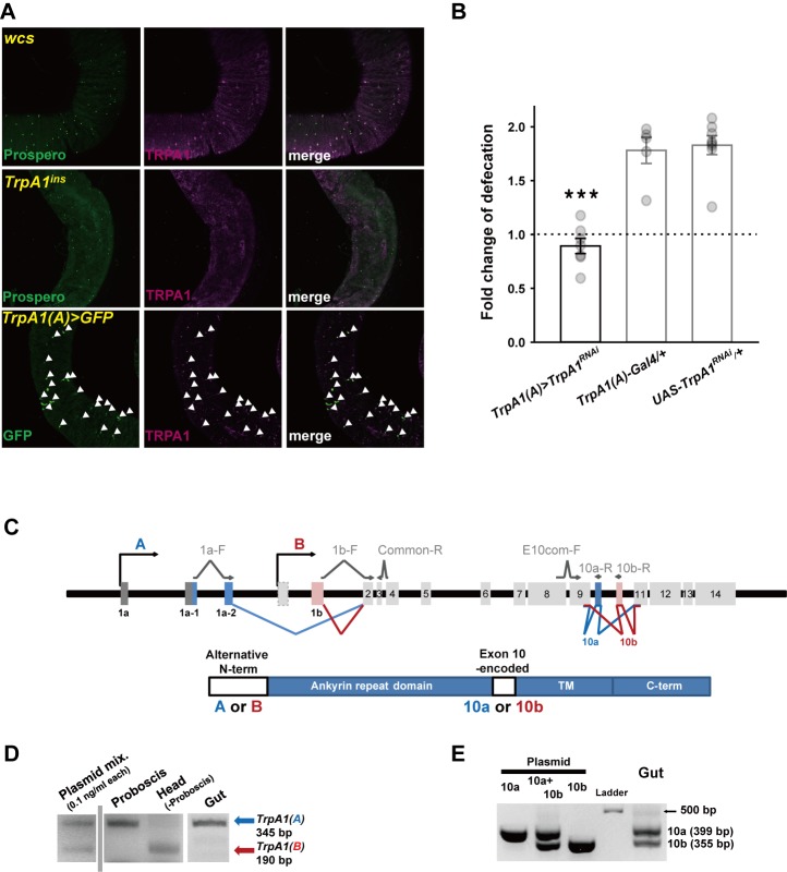 TrpA1 gene structure illustrating alternative exon usage (Top) and TRPA1 protein organization showing variable domains (Bottom). The primers used in reverse transcription PCR analyses shown in (D and E) are indicated as arrows. Most of primers in these analyses were designed to straddle two separate exons in order to prevent PCR amplification of genomic DNA. D and E The representative results of RT-PCR analyzing alternative exons of TrpA1 transcripts in the gut for the N-terminal (D) and exon10-encoded domains (E). ‘Plasmid’ indicates the PCR reactions with cloned cDNAs of TrpA1 transcripts as DNA polymerization templates, and the bands resulting from the‘plasmid’ reaction were used as size and intensity markers. Proboscis, Head and Gut denote the tissues where total RNA was prepared for reverse transcription. The band of the “Ladder” lane is a 500 bp long DNA fragment of Generuler 1 kb ladder (E). 10a and 10b indicate cDNA templates or PCR products of TrpA1(A)10a and TrpA1(A)10b, respectively, and the PCR products from the template of cloned cDNA (indicated by ‘Plasmid’) serve as size markers for the RT-PCR experiments with total cDNA prepared from the gut. Bar graphs show mean ± SEM with distribution. ***: p<0.001, Tukey test.