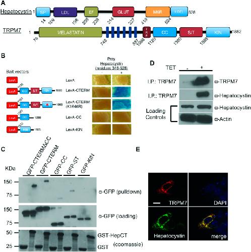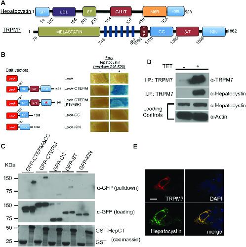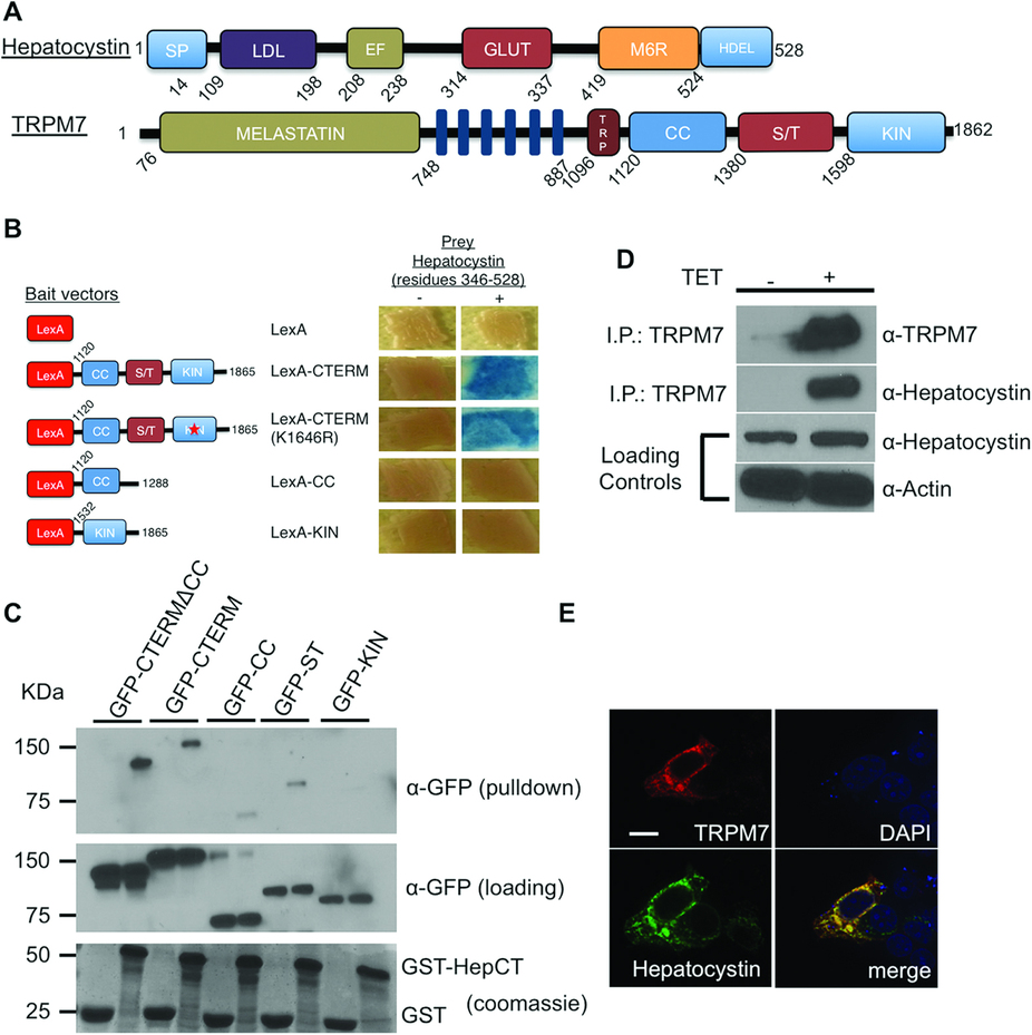 Figure 1: Hepatocystin interacts with TRPM7. (A) Schematics of the linear structures and domains of TRPM7 and hepatocystin. TRPM7 contains an NH2-terminus melastatin domain, six transmembrane domain, TRP box, as well as coiled-coil (CC), serine/threonine rich domain (ST), and functional alpha kinase (KIN) domains. Hepatocystin contains a leader signal peptide (SP), a low-density lipoprotein class A (LDL) domain, two Ca2+-binding EF hands, a glutamic acid-rich segment (GLUT), a region with low homology to the mannose 6-phosphate receptor (MRH), and a COOH-terminal His-Asp-Glu-Leu (HDEL) ER retention signal. (B) Directed yeast-two-hybrid assay using the indicated fragments of TRPM7 COOH-terminus fused to LexA as bait and Gal4 fused residues 346-528 of hepatocystin as prey. LexA fused to Laminin (Lex-Lam) served as a negative control. (C) Pulldown purification assay using GST fused to residues 346-528 of hepatocystin (GST-HepCT) against HEK-293 cell lysates containing the indicated mfGFP-tagged TRPM7 COOH-terminal fragments. (D) Endogenous hepatocystin co-immunoprecipitates with HA-tagged TRPM7 heterologously expressed in HEK-293T cells. (E) Immunocytochemistry of HEK-293T cells transfected with HA-tagged TRPM7 and FLAG-tagged hepatocystin (Green) show that the two proteins co-localize in the endoplasmic reticulum (ER). A scale bar of 20 microns in length is indicated.