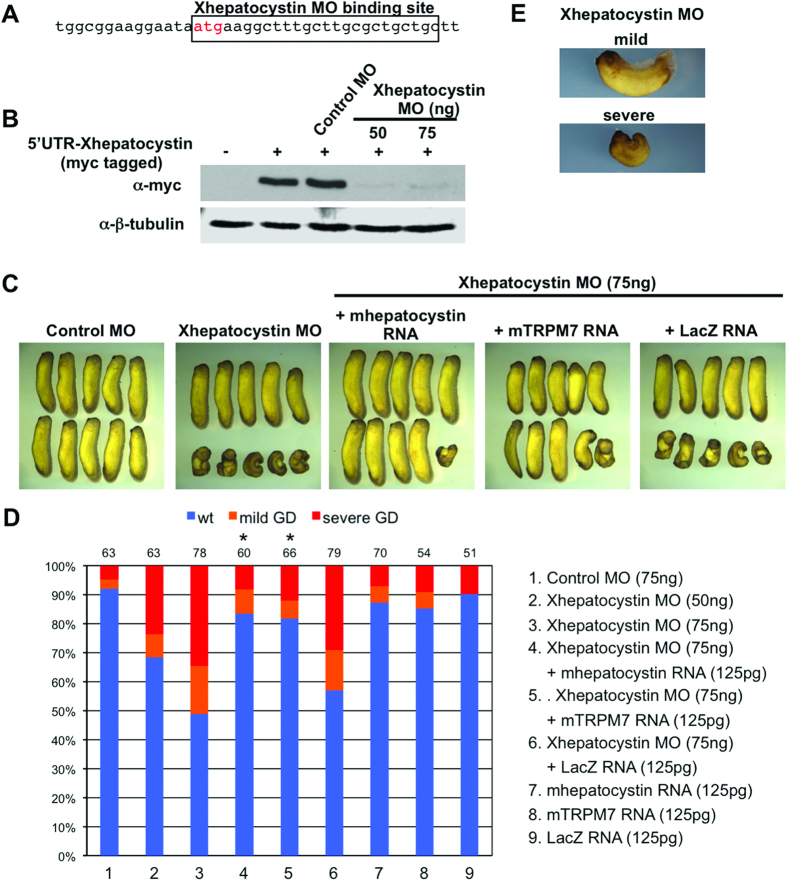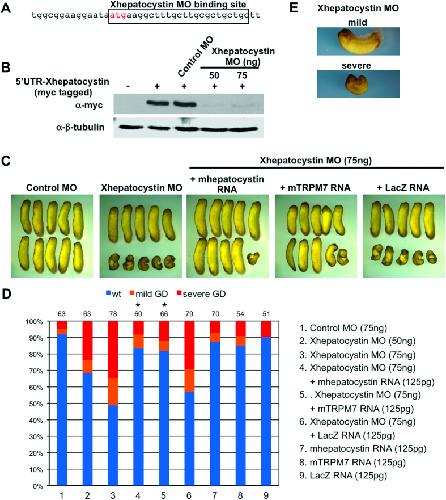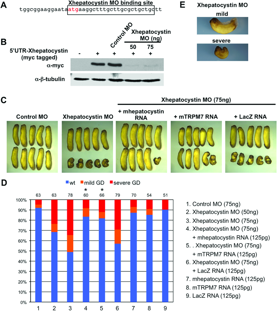Figure 3. Xhepatocystin is required for gastrulation.(A) Schematic diagram of Xhepatocystin morpholino (MO) binding sites upstream and overlapping the start site of Xhepatocystin. (B) Western blot analysis shows that injection of the Xhepatocystin MO (50 and 75âng), but not the control MO (75âng), can effectively inhibit translation of Myc-Xhepatocystin 5â² UTR injected RNA (250 pg). β-tubulin is shown as a loading control. (C) Injection of Xhepatocystin MO into the dorsal blastomeres of the 4-cell stage embryos inhibited gastrulation. The gastrulation defect phenotype was rescued by co-injection of mouse hepatocystin RNA and mouse TRPM7 RNA (125 pg), but not LacZ RNA (125 pg), with the Xhepatocystin MO (75âng). Injection of the control MO (75âng) produced no phenotype. (D) Quantification of phenotypic results from (C). Phenotypes were scored according to the severity of the gastrulation defect (GD) at the tadpole stage (E). The injections were repeated at least three times. The ability of co-injection of mouse hepatocystin and mouse TRPM7 RNA with Xhepatocystin MO to rescue the gastrulation phenotype caused by the Xhepatocystin MO was statistically significant (*P<0.05). The collective total number of injected embryos from all experiments is indicated above each bar.
