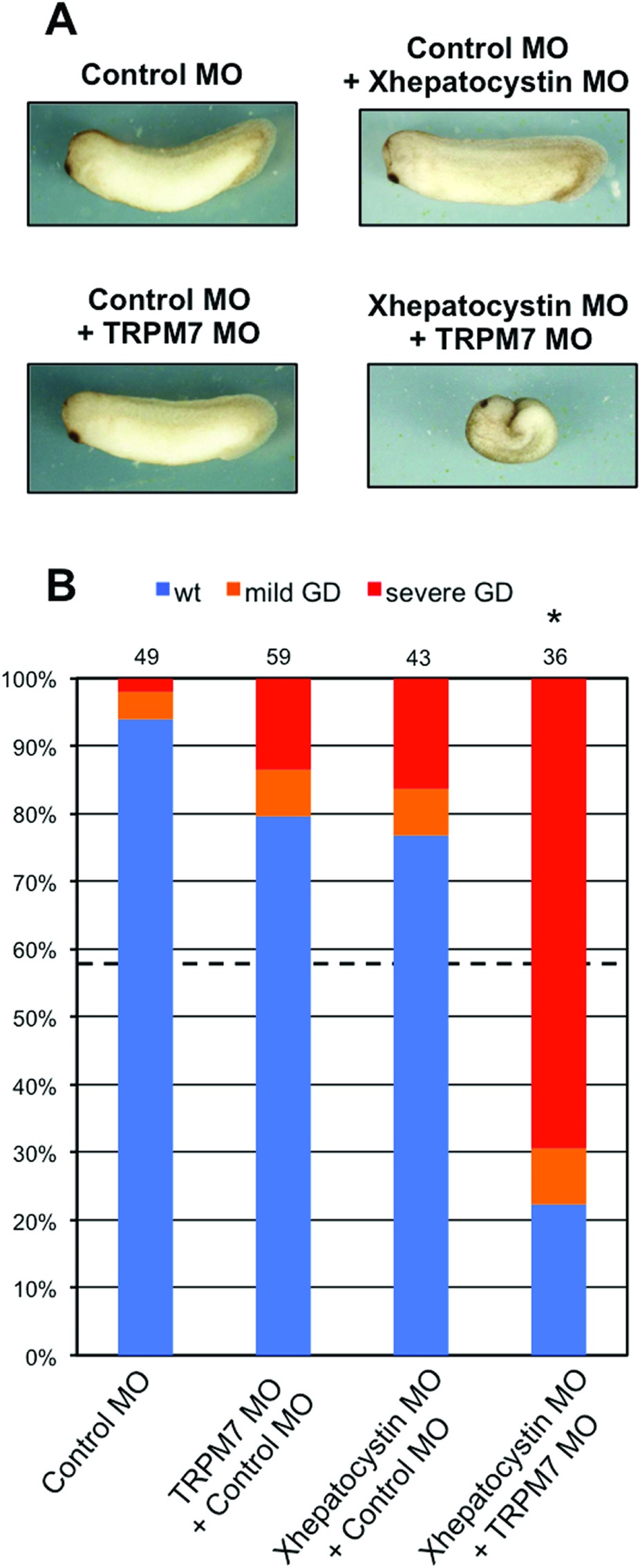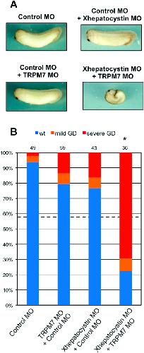 Figure 4: TRPM7 and hepatocystin functionally interact. (A,B) Co-injection of Xhepatocystin MO (15âng) and XTRPM7 MO (15âng) synergistically inhibit gastrulation, but have little or no effect when injected separately. (B) Phenotypes were scored according to the severity of the gastrulation defect (GD) at the tadpole stage. The dotted line in (B) indicates the amount of gastrulation defects that would be expected if the effects were additive (43%). The injections were repeated three times. Statistic analysis indicated that the number of embryos exhibiting gastrulation defects (77%) by co-injection of Xhepatocystin and XTRPM7 MOs was significantly different (P=0.05) from what would be expected if the effects were additive (43%). The collective total number of injected embryos from all three experiments is indicated above each bar.
