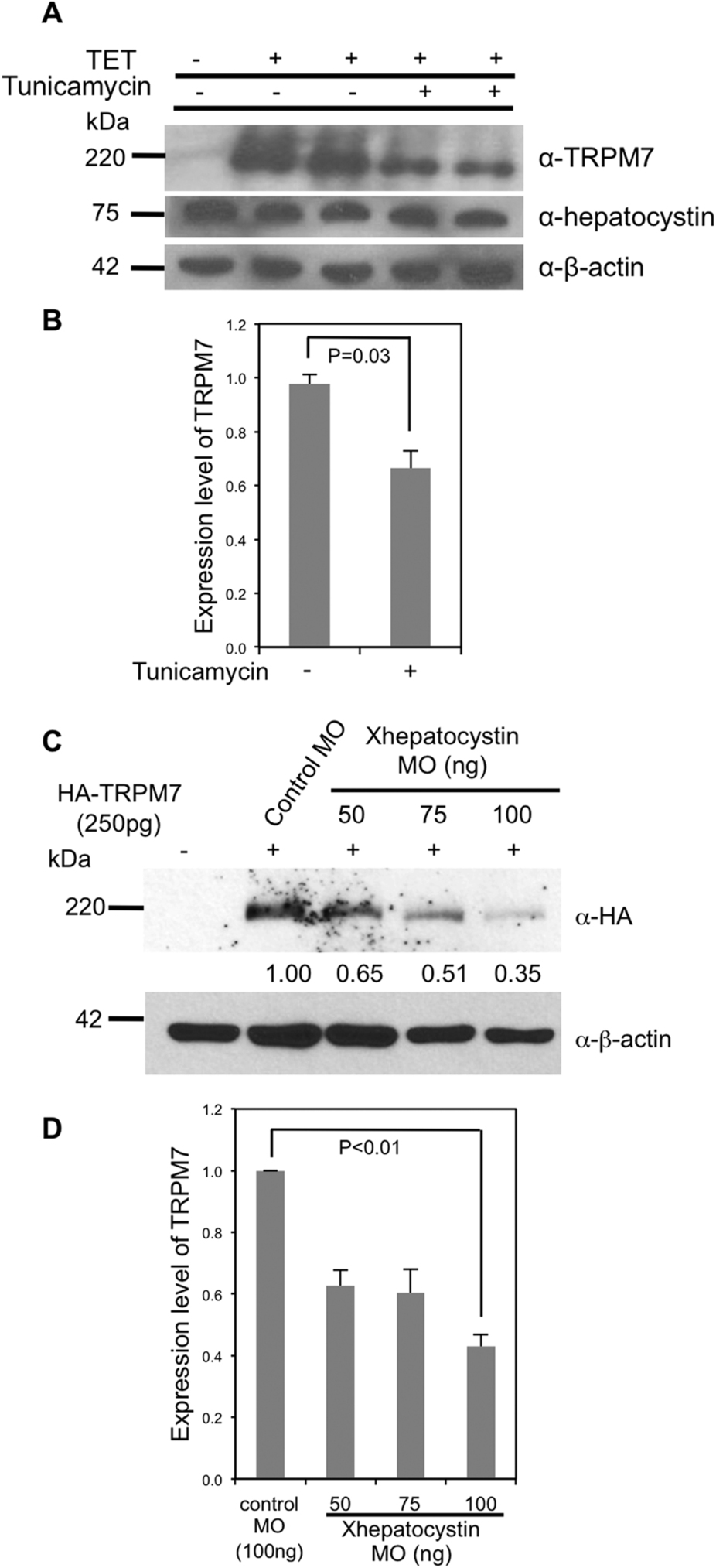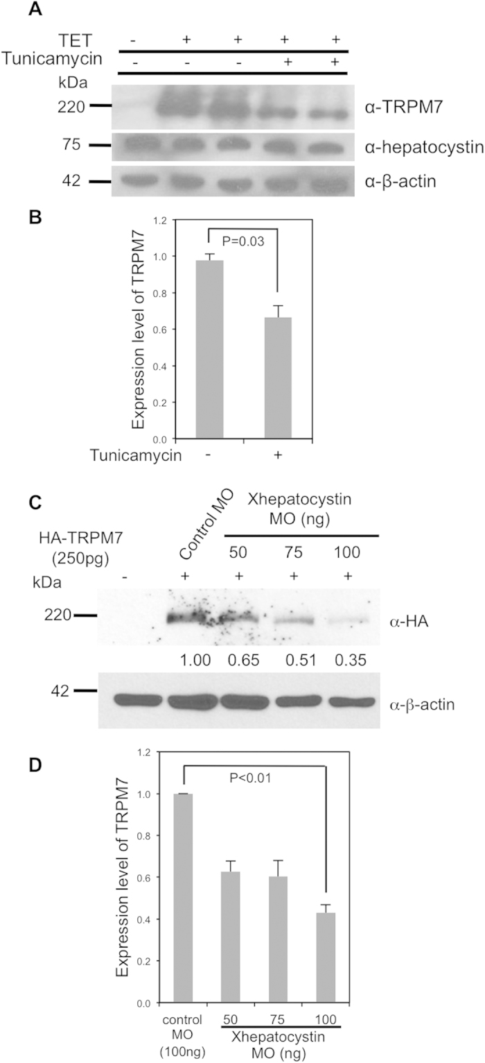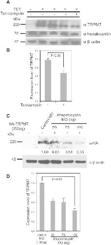 Figure 5. Hepatocystin and N-glycosylation affect the abundance of TRPM7.(A) Treatment of cells with tunicamycin (5 μg/ml) for 24 hours decreased tetracycline-induced TRPM7 protein expression in 293-TRPM7 cells. (B) Quantification of data from (A). (C) Co-injection of increasing dosages of the Xhepatocystin MO with 250 pg mRNA of HA-tagged mTRPM7 (HA-TRPM7) decreases TRPM7 expression in Xenopus embryos at stage 17. β-actin is shown as a loading control. (D) Quantification of data from (C). The experiments were repeated at least three times.