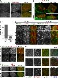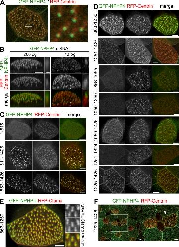 Figure 1. Localization of full-length and truncated NPHP4 in multiciliated cells of the Xenopus epidermis. At the four-cell stage, Xenopus embryos were injected with mRNA for GFP-NPHP4 (green in merge), together with mRNAs for RFP-Centrin or RFP-Clamp (red in merge) to label basal bodies and ciliary rootlets, respectively. At stage 32, confocal microscopy was performed to study the localization of full-length and truncated NPHP4 in the cells with multiple motile cilia of epidermal skin. Maximum intensity projection of obtained confocal datasets is shown, unless noted otherwise. (A) Colocalization of GFP-NPHP4 with RFP-Centrin. Area enclosed by the white box is magnified in the right panel (5.3× magnification; see Fig. S1 A for separate GFP and RFP channels). (B) 3D reconstruction of confocal datasets is shown. Injection of mRNA encoding for GFP-NPHP4 (200 pg) revealed the broad localization of GFP-NPHP4 extending from the basal body to the presumptive transition zone distal to the basal body, whereas lower-dose injection of mRNA (70 pg) revealed a more confined localization of GFP-NPHP4 to the presumptive transition zone. The insets are magnified on the right panels. (C–F) Localization of NPHP4 truncations is studied. Numbers on the left of the panels indicate the first and last amino acid of the NPHP4 truncations. Expression of all constructs was confirmed by Western blot. (C) The C-terminal half of NPHP4 (amino acids 863–1,426) is sufficient for localization to the basal body. (D–F) The C-terminal half of NPHP4 contains two distinct subdomains targeting NPHP4 to the basal bodies: amino acids 863–1,250 and amino acids 1,251–1,426. (E) The first subdomain (amino acids 863–1,250) showed additional localization to the ciliary rootlet, colocalizing with RFP-Clamp. The inset is magnified by 2.4× on the right panels. (F) The C-terminal fragment spanning amino acids 1,225–1,426 showed enhanced localization to the plasma membrane (arrowhead). Area enclosed by the white box is magnified in the right panel. Bars: (main) 5 µm; (B, magnified insets) 500 nm. |