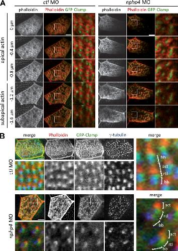 Figure 3. Nphp4 is essential for the organization of the subapical actin layer. (A) Serial confocal images for actin (phalloidin) and ciliary rootlets (GFP-Clamp) of cells with multiple motile cilia revealed that the subapical actin layer became irregular in nphp4-deficient Xenopus embryos, whereas apical actin pool remained unaffected. The depth of each optical section from the first section is shown on the left. A magnified image of the inset is shown on the right side (4× magnification). (B) Triple staining for actin (phalloidin, red in merge), ciliary rootlets (GFP-Clamp, green in merge), and basal bodies (γ-tubulin, blue in merge) revealed that actin filaments in the subapical actin layer connect a basal body with the ciliary rootlet of the neighboring basal body. In nphp4-deficient cells, the subapical actin layer was poorly nucleated and failed to provide the connection between basal bodies. Top panels show the maximum intensity projection of serial confocal images. Single optical sections at the level of the subapical actin pool (boxed area) are magnified and shown in the bottom panels (4.5× magnification). Right panels are higher magnification images of the single optical sections depicting the subapical actin organization (10.5× magnification). act, actin; bb, basal body; rtl, ciliary rootlet. Bars, 5 µm. |