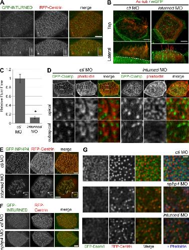 Figure 5. Inturned plays a role similar to Nphp4 for normal ciliogenesis, and basal body localization of Inturned requires Nphp4. (A) GFP-tagged INTURNED (green in merge) preferentially localized to a region distal to the basal body labeled by RFP-Centrin (red in merge). Maximum intensity projection (top) and 3D reconstruction (bottom) of confocal images are shown. The representative localization pattern is shown magnified in the inset (4.3× magnification). (B) Confocal imaging of cilia stained with anti–acetylated tubulin (Ac-tub). Reduced number of cilia formed above the apical cell surface after injection of 17 ng inturned MO. Maximum intensity projection (top) and the projection in the x-z plane (bottom) of confocal images are shown. Dashed line indicates the apical surface of cells as revealed by membrane-associated GFP (mGFP; green). (C) 8 ng inturned MO–injected embryos presented with a decreased rate of ciliary fluid flow across the epidermis. Shown is the summary of four independent experiments (n ≥ 39; t test; *, P = 0.0014). (D) Injection of 8 ng inturned MO resulted in a reduced nucleation of the subapical actin pool as well as fragmentation of apical actin web. Actin and ciliary rootlet were stained with phalloidin (red in merge) and GFP-Clamp (green in merge), respectively. (Top) Maximum intensity projection of serial confocal images. The area enclosed by white boxes was magnified (5.6×); single optical sections at the level of apical actin pool (middle) and subapical actin pool (bottom) are shown. Bars, 5 µm. (E) Localization of GFP-NPHP4 (green in merge) to the basal body (RFP-Centrin, red in merge) was only slightly affected by the depletion of inturned (7 ng MO). Areas enclosed by the white boxes are magnified in the insets (2.5×). Only a small subset of basal bodies in the inturned-deficient cells revealed a reduced accumulation of NPHP4 (asterisks). (F) Depletion of nphp4 (8 ng MO) resulted in a reduced colocalization of GFP-INTURNED (green in merge) with the basal bodies, and GFP-INTURNED revealed a more homogenous distribution in nphp4-deficient cells. (G) Whereas GFP-Daam1 was closely associated with the actin filaments in Xenopus epidermal cells microinjected with a control MO (ctl MO; Fig. S3 F), the depletion of nphp4 or inturned in Xenopus epidermal skin cells decreased both actin and GFP-Daam1 in the subapical region. The image depicts three z sections at a −600 nm in cells as indicated. Bars, 1 µm. |