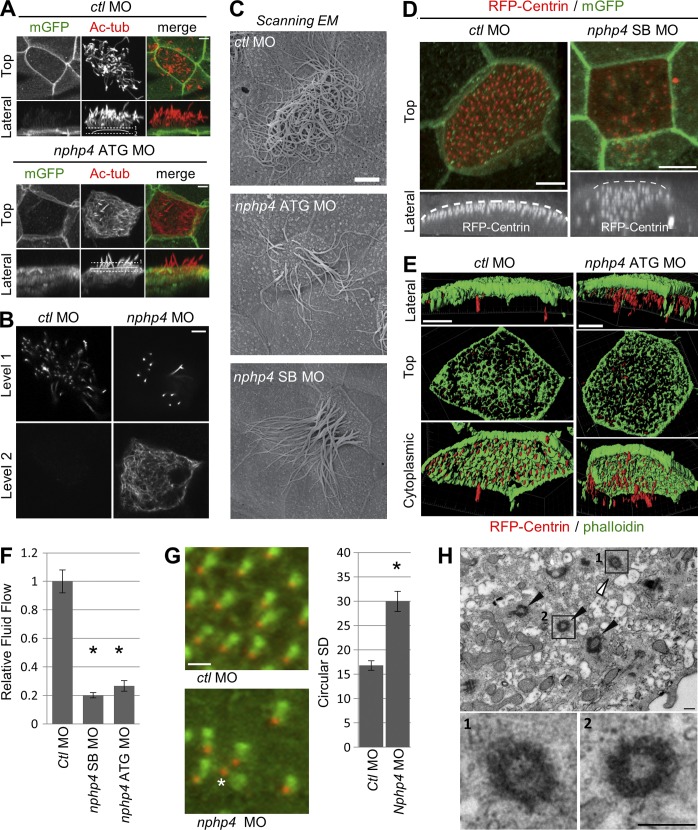 Figure 2. Xenopus Nphp4 is essential for building functional cilia. (A and B) Confocal microscopy of multiciliated cells of Xenopus epidermal skin. Cilia and apical cell surface are labeled with antiâacetylated tubulin (Ac-tub; red in merge) and membrane-targeted GFP (mGFP; green in merge). (A) Maximum intensity projection (top), and 3D reconstruction projected in the x-z plane (lateral) for the confocal datasets are shown. The apical surface is indicated by a solid white line. Embryos injected with 20 ng control morpholino (ctl MO) showed normal ciliogenesis, whereas 20 ng nphp4 ATG MOâinjected embryos showed ciliogenesis defects. (B) Single optical sections comparing the signals for antiâacetylated tubulin at levels 1 and 2 in ctl MOâ and nphp4 ATG MOâtreated Xenopus embryos (see dashed white lines in the lateral views of A) revealed that ciliary microtubules are nucleated below the apical cell surface in nphp4-deficient, but not ctl MOâtreated, Xenopus embryos. (C) Scanning EM of the Xenopus epidermis confirmed the ciliogenesis defect in 16 ng nphp4 ATG MOâ and 8 ng nphp4 SB MOâinjected Xenopus embryos. (D) Labeling of basal bodies and the apical cell surface with RFP-Centrin and mGFP revealed that basal bodies are aligned along the apical cell surface and distributed uniformly across the cell surface in ctl MOâinjected Xenopus embryos. In contrast, basal bodies in nphp4 MOâinjected Xenopus embryos failed to migrate to the apical cell surface and remained within the cytoplasm. (Top) Maximum intensity projection of confocal datasets. (Bottom) Serial confocal images projected in the x-z plane with the apical cell surface indicated by a dashed white line. (E) The multiciliated cells of the Xenopus epidermis formed a dense actin cytoskeleton (phalloidin, green) at the apical cortex. Apically localized basal bodies (RFP-Centrin, red) were embedded in this actin web (left). In nphp4-deficient Xenopus embryos, basal bodies remained within the cytoplasm below the apical actin web, which is also thinner than in control cells (right). Confocal 3D datasets were processed with Imaris software, and the lateral (top), top (middle), and cytoplasmic (bottom) views are shown. (F) Depletion of nphp4 resulted in a decreased rate of cilia-driven fluid flow as revealed by the movement of polypropylene beads across the epidermis. Shown is a summary of four independent experiments (n ⥠25). Error bars, SEM; t test; *, P < 0.002. (G) nphp4-deficient Xenopus embryos showed a mild perturbation of basal body polarization, revealed by the relative position of the basal bodies (RFP-Centrin) and the ciliary rootlets (GFP-Clamp). A moderate dose of 6.8 ng nphp4 SB MO was injected to allow apical docking of basal bodies, a prerequisite for polarization. The right panels show the magnified images for the regions enclosed by white boxes. Only a small number of basal bodies were incorrectly polarized (asterisk) in nphp4-deficient cells. The polarization was quantified by angular measurements of Clamp/Centrin pairs. Depletion of nphp4 resulted in a moderate increase of circular standard deviation as compared with the control. Error bars, SEM. (H) Transmission electron microscopy detected occasional ciliary axonemes (white arrowhead, box 1), and a large number of basal bodies (black arrowheads, box 2) in the cytoplasm of nphp4-depleted Xenopus multiciliated cells. Bars: (AâE) 5 µm; (G) 1 µm; (H) 200 nm. |