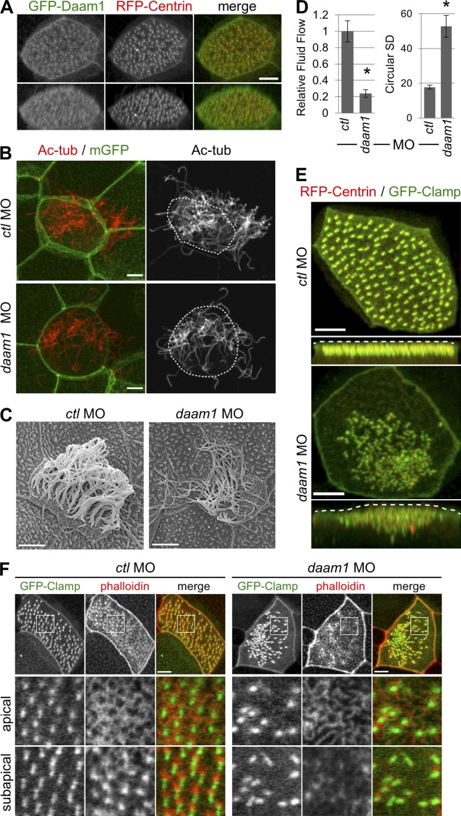 Figure 4. daam1-deficient multiciliated cells recapitulate the ciliary phenotypes of nphp4-deficient cells. (A) GFP-tagged Daam1 (green in merge) preferentially localized to a region distal to the basal body (RFP-Centrin, red in merge) at the apical surface. Maximum intensity projection (top) or 3D reconstruction (bottom) of confocal images is shown. (B) Confocal imaging of cilia (Ac-tub, red). As compared with the control, reduced number of cilia formed above the apical cell surface (membrane-associated GFP [mGFP], green) after injection of 12 ng daam1 MO. The apical cell surface is depicted by dashed white lines on the right panels. (C) The ciliogenesis defect was confirmed by scanning electron microscopy. (D) daam1-deficient Xenopus embryos show a decreased rate of cilia-driven fluid flow across the epidermis (four independent experiments with n > 45; error bars, SEM; t test; *, P = 0.0014). Depletion of daam1 was also associated with a polarity defect and an increase in circular SD (t test; *, P < 0.001). (E) Basal bodies in daam1-deficient multiciliated cells failed to migrate to the apical cell surface and remained in the cytoplasm. Basal bodies and ciliary rootlets were labeled with RFP-Centrin and GFP-Clamp. Maximum intensity projection (top) or projection in the x-z plane (bottom) of serial confocal images are shown. The apical cell surface is indicated by dashed white line. (F) The subapical actin layer displayed irregularities in daam1–deficient multiciliated cells. Ciliary rootlets were labeled with GFP-Clamp (green in merge) and actin stained with phalloidin (red in merge). (Top) Maximum intensity projection of serial confocal images. Single optical sections at the level of apical and subapical actin layer of the boxed area are shown magnified in the middle and bottom panels (4× magnification). Bars, 5 µm. |