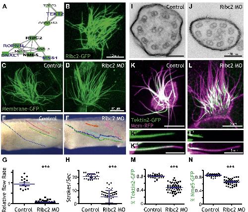 Figure 4. Ribc2 is required for ciliary motility. (A) Ribc2 is clustered in HumanNet with known ciliary beating components, such as Dnal1, Ropn1l, and Mns1 (B) Ribc2-GFP is localized along the axoneme. (C) An MCC of a stage 27 control embryo injected with membrane-GFP. (D) An MCC of a stage 27 embryo injected with Ribc2 morpholino. Ribc2 is not essential for cilia assembly. Tracking of latex beads moving across the epidermis of the control embryo (E) and the Ribc2 morphant (F). An arrow represents the moving distance per time frame. The relative average flow rate is shown in (G). While the average flow rate of control is normalized to 1 ± 0.075 (mean ±SEM), it is significantly reduced to 0.085 ± 0.008 in Ribc2 morphants. (H) Quantification of ciliary beating using high-speed confocal (Videos 3 and 4). Beat frequency is 20.59 ± 0.410 strokes/s in control whereas only 5.29 ± 0.635 strokes/s following Ribc2 knockdown. Ultrastructure of axoneme from a control embryo (I) and a Ribc2 knockdown embryo (J) were visualized using TEM. Lack of dynein arms were observed in Ribc2 morphants. (K) A MCC of a stage 27 control embryo injected with Tektin2-GFP and membrane-RFP. Enlarged view of an axoneme is shown in (Kâ²) (Kâ²â²). (L) A MCC of a stage 27 Ribc2 morphant. Enlarged view is shown in (Lâ²) (Lâ²â²). (M) Tektin2-GFP generally decorates 80% (±0.8) of the axoneme as marked by membrane-RFP; this ratio is significantly reduced, to 48% (±1.6), following Ribc2 knockdown (N). Nme5-GFP generally decorates 86% (±0.5) of the axoneme; this ratio is significantly reduced, to 66% (±1.2), following Ribc2 knockdown. ***p < 0.0001 MannâWhitney test. |