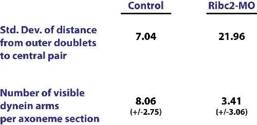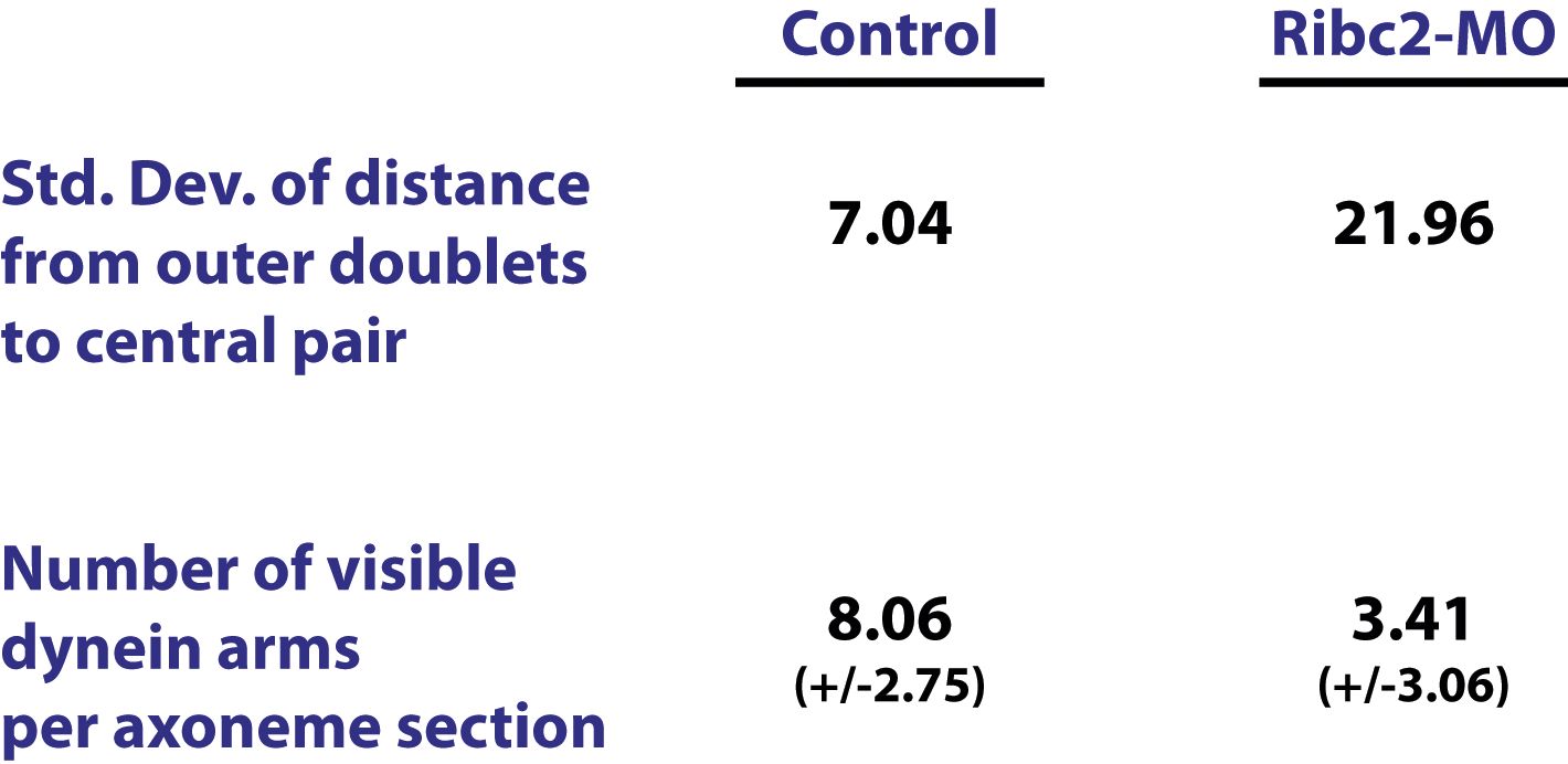 Figure 4—figure supplement 1. Ribc2 is required for axonemal organization. Blind analysis of distance from outer doublets to central pair and visible dynein arms in control and Rfibc2 morphants. |