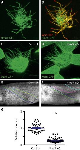 Figure 4âfigure supplement 2. Nme5 is required for ciliary motility.(A and B) A MCC of a stage 27 embryo injected with Nme5-GFP and membrane-RFP. (C) A MCC of a stage 27 control embryo injected with membrane-GFP. (D) A MCC of a stage 27 embryo injected with Nme5 morpholino. Ribc2 is not essential for cilia assembly. Tracking of latex beads moving across the epidermis of the control embryo (E) and the Ribc2 morphant (F). An arrow represents the moving distance per time frame. The relative average flow rate is shown in (G). While the average flow rate of control is normalized to 1 ± 0.036 (mean ±SEM), it is significantly reduced to 0.24 ± 0.011 in Nme5 morphants. Control: n = 42, 3 embryos. Ribc2MO: n = 88, 3 embryos. ***p < 0.0001 MannâWhitney test. Scale bar: 10 µm.DOI: http://dx.doi.org/10.7554/eLife.01439.016 |