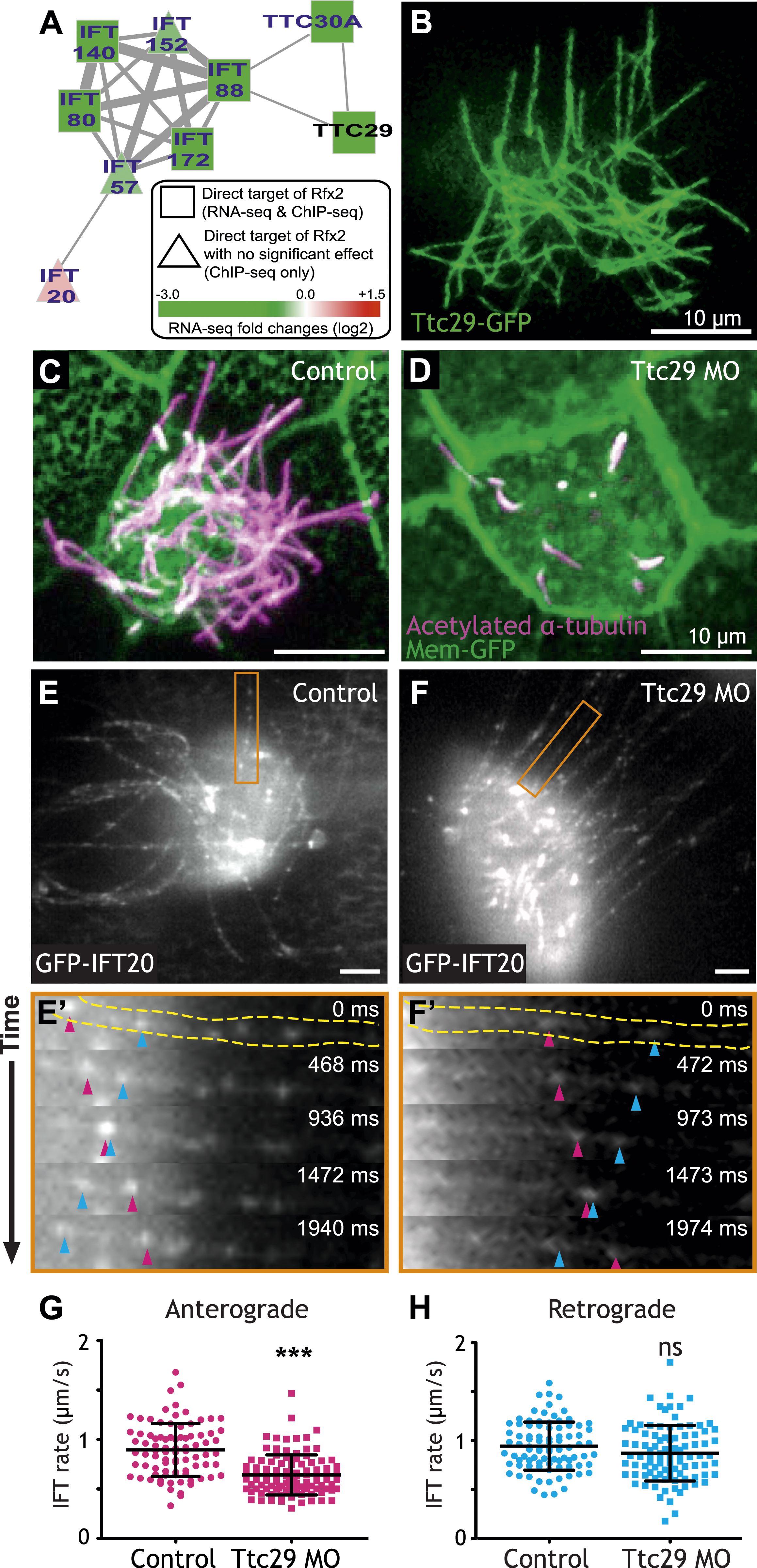 Figure 3. Ttc29 is required for ciliogenesis of MCCs by regulating Intraflagellar Transport. (A) Ttc29 is clustered with IFT components in HumanNet. (B) Ttc29-GFP is localized in the axoneme. (C) A MCC of a stage 27 control embryo injected with membrane-GFP. Acetylated α-tubulin labels cilia and GFP labels the cell boundary. (D) A MCC of a stage 27 Ttc29 morpholino-injected embryo. Note that only a few short axonemes are shown following Ttc29 knockdown. (E) Still-frame of a control multiciliated cell expressing GFP-IFT20. The axoneme shown in the time series (Eâ²) is labeled in orange (Video 1). (Eâ²) A time-series of a single control axoneme from (E) shows processive bi-directional traffic (the distal tip of the axoneme is to the right; pink arrowheads denote an anterograde train over time, blue arrowheads indicate a retrograde train). (F) A single still frame from a Ttc29 MO treated multi-ciliated cell expressing GFP-IFT20 (Video 2). (Fâ²) A time-series of a single axoneme from (F). Note that processive bi-directional traffic is qualitatively normal. (G) Quantification of anterograde GFP-IFT20 rates shows a significantly slower average anterograde rate upon Ttc29 MO treatment (Control: n = 97 IFT trains, 40 axonemes, 21 Cells, 6 embryos. Ttc29 MO: n = 100 IFT trains, 53 axonemes, 20 cells, 6 embryos. p < 0.0001). (H) Quantification of retrograde GFP-IFT20 rates reveals no significant difference between control and Ttc29 MO conditions (Control: n = 87 IFT trains, 40 axonemes, 21 cells, 6 embryos. Ttc29 MO: n = 94 IFT trains, 53 axonemes, 20 cells, 6 embryos. p = 0.0510). |