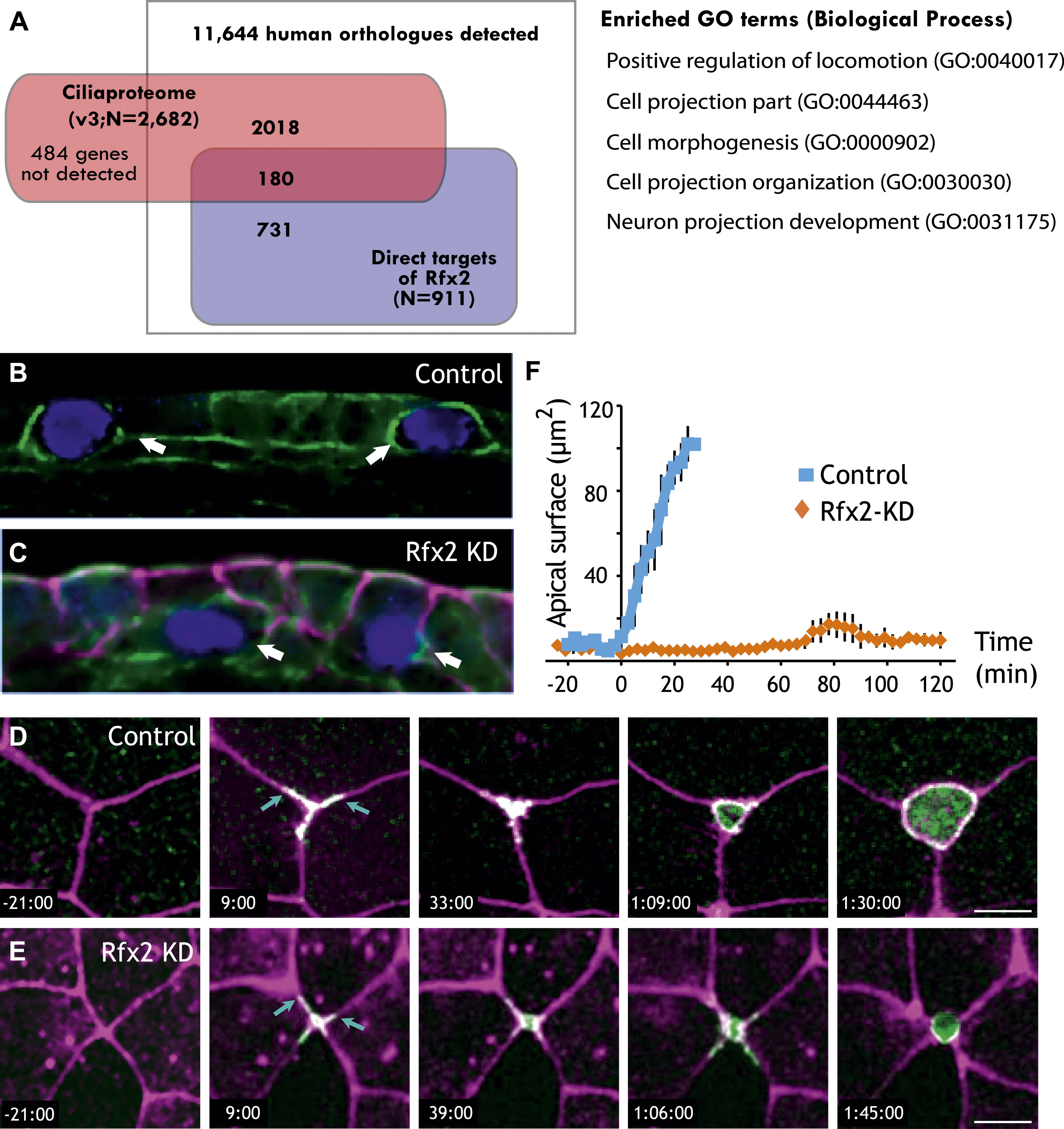Figure 5. Rfx2 is essential for the insertion of nascent MCCs into the mucociliary epithelium. (A) Overlap of Rfx2 target genes and the âcilia proteomeâ (as defined in Gherman et al., 2006; see âMaterials and methodsâ). Out of 911 direct target genes of Rfx2 identified in this study, only 20% of them (180 genes) are annotated as known cilia genes. Right panel represents the Gene Ontology terms significantly enriched among direct targets of Rfx2 (biological process category only; Benjamini corrected p<0.05) (B) A cross-sectional view of a control embryo labeled with ciliated cell marker (cyan). Apical surface is up. MCCs have inserted into the mucociliary epithelium (arrows). (C) A cross-sectional view of an Rfx2 morpholino-injected embryo. MCCs fail to insert into the overlying epithelium (arrows). To observe the insertion of MCCs into the overlying epithelium of control embryos (E) and Rfx2 morphants (D), a MCC-specific α-tubulin enhancer element driving expression of Utrophin-GFP was used. (D) Note the control MCC first exhibited a star-shaped morphology and cell protrusions probed into overlying cellâcell boundaries (arrows). The probing phase then ceased and apical surface expanded (Videos 5 and 6). (E) Protrusions of the MCC were observed, indicating the initial probing was qualitatively normal following Rfx2 knockdown. However, apical surface expansion was strongly inhibited in MCCs (Video 7). (F) Quantification of apical surface area of MCCs of control embryos and Rfx2 morphants. |