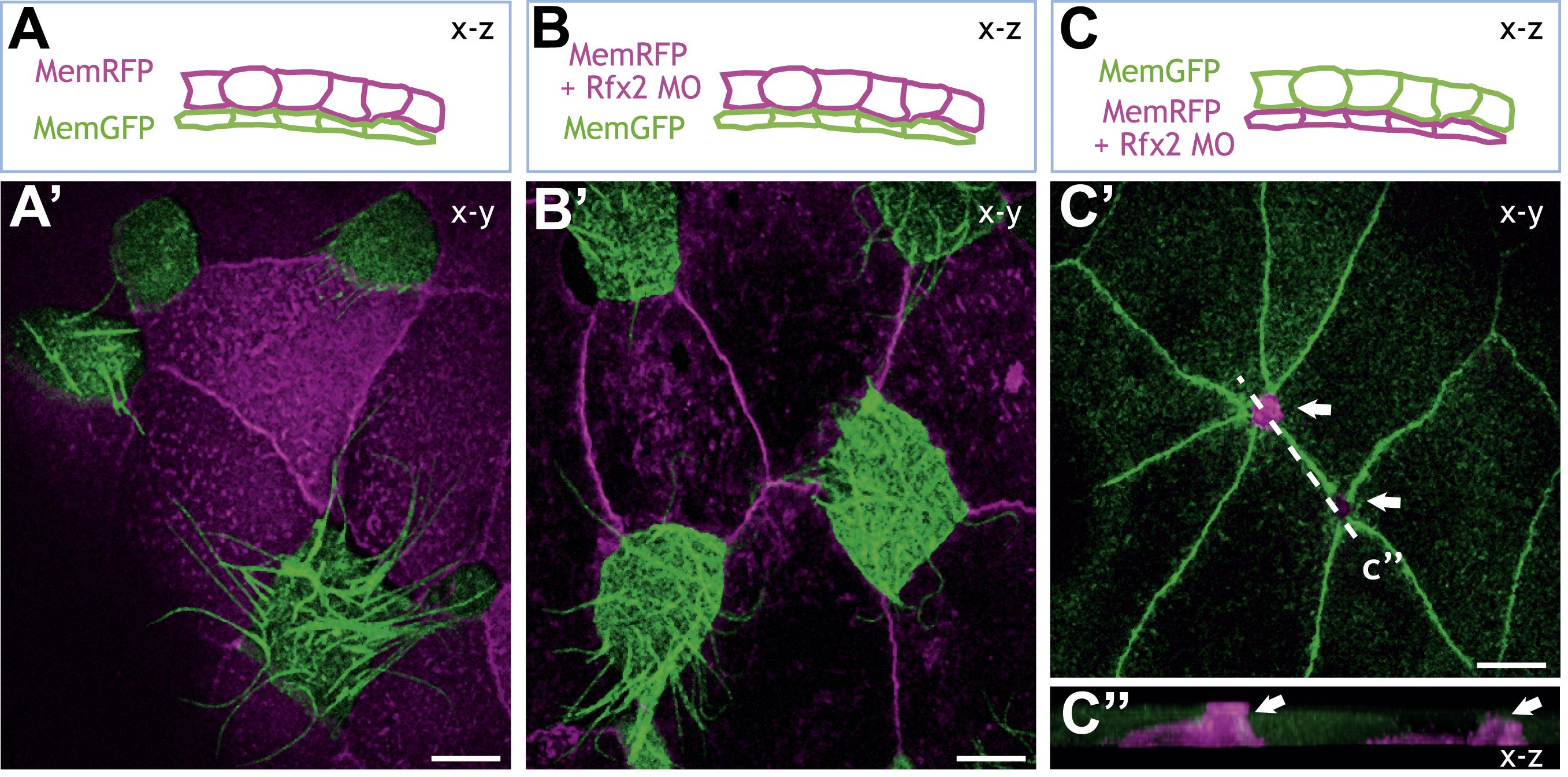 Figure 6. Rfx2 acts cell-autonomously to control insertion of nascent MCCs into the overlying epithelium. (A)â(C) Illustration of the transplantation experiments. The superficial layer from either control (A) (Aâ²) or Rfx2 knockdown embryos (B) (Bâ²) was transplanted to the control host embryos. (C) (Câ²) the superficial layer from control embryos was transplanted to the Rfx2 knockdown embryos. At stage 26, MCCs derived from the control host have intercalated into the outer layer transplanted from either control (Aâ²) or Rfx2 knockdown embryos (Bâ²). (Câ²) MCCs, in which Rfx2 was knocked down, failed to insert properly into control outer epithelium. (Câ²â²) A z-view of two MCCs in (Câ²). |
