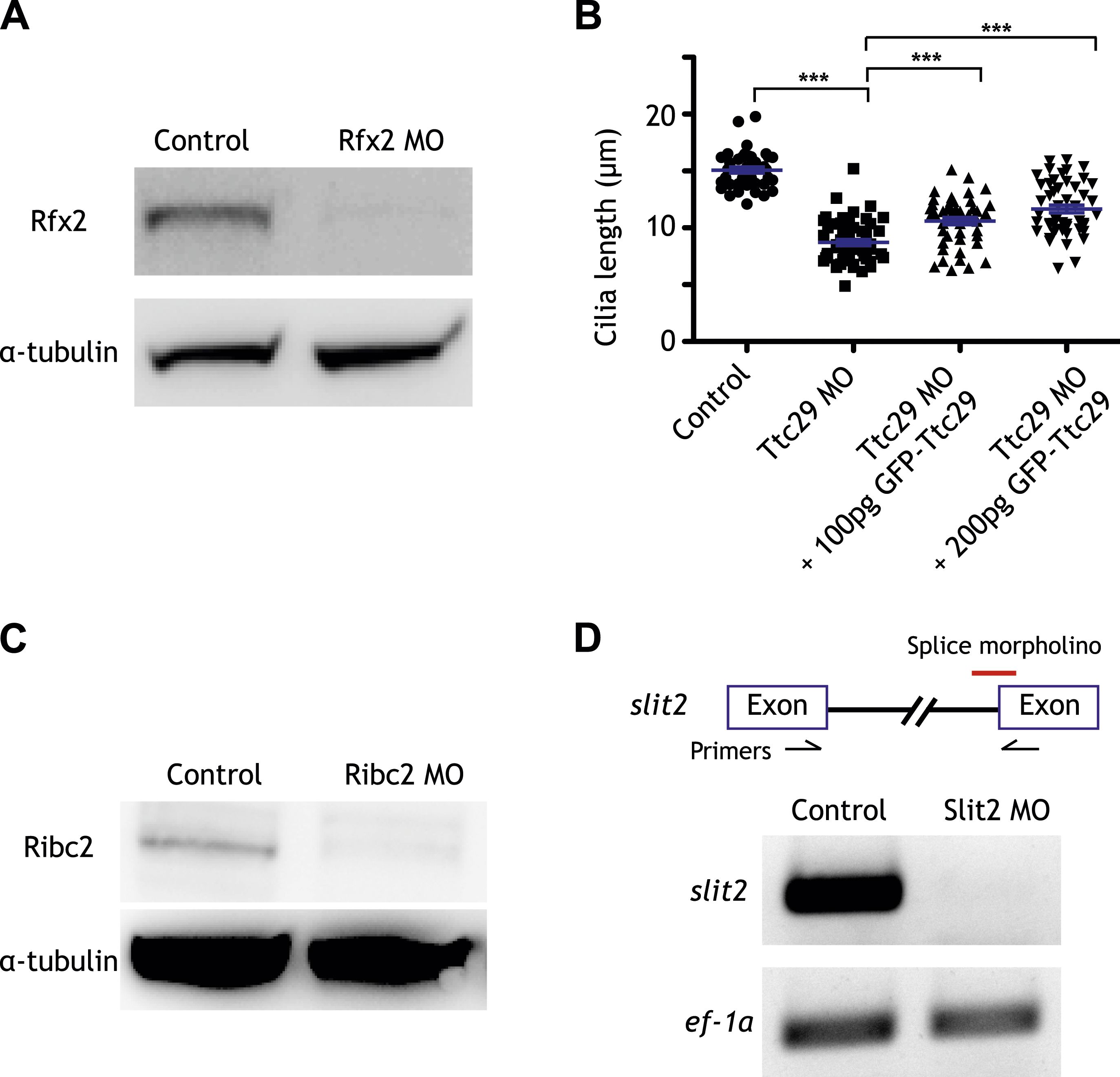 Figure 2âfigure supplement 1. Controls for the morpholino antisense oligonucleotides used in this study. (A) The amount of Rfx2 protein was reduced in Rfx2 morphants. α-tubulin served as a loading control. (B) Cilia length was significantly reduced following Ttc29 knockdown. The phenotype can be partially rescued by co-injection with GFP-Ttc29 mRNA. (C) The amount of Ribc2 protein was reduced following Ribc2 knockdown. α-tubulin served as a loading control. (D) The expression of slit2 was reduced following Slit2 knockdown. |