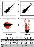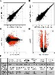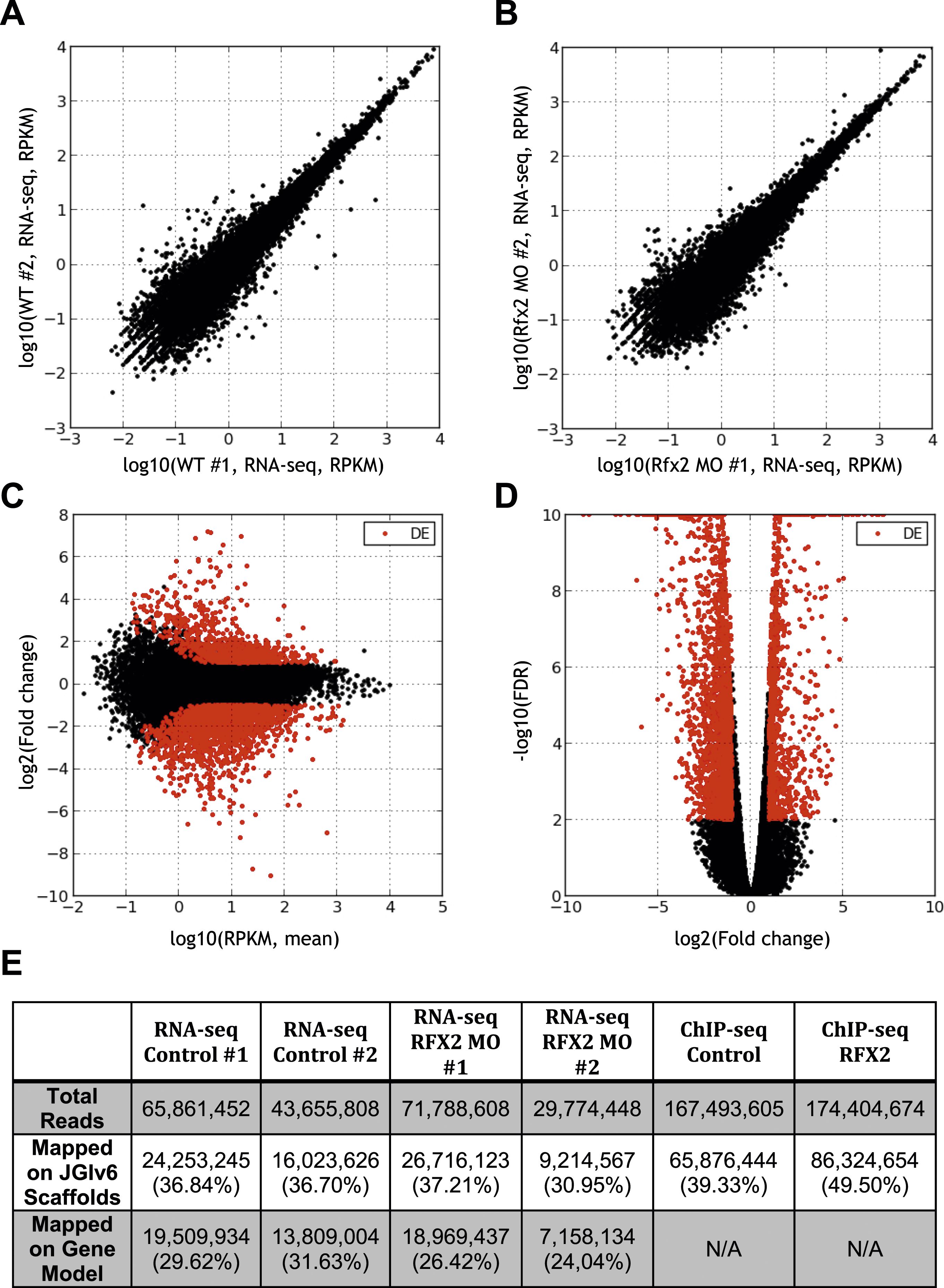 Figure 2âfigure supplement 2. Summary of RNA-seq data. (A) Correlation between RNA abundances from the replicate wild-type control samples, (B) correlation between RNA abundances from the replicate RFX2 knockdown samples, (C) MA-plot showing the relationship between fold-change and average abundance of each gene, and (D) Volcano plot showing the relationship of fold-change to FDR (adjusted p-value for differential expression). Genes differentially expressed in Rfx2 knockdown samples are indicated as red dots on (C) and (D). No systematic biases were evident among the differential expressed genes. Although the numbers of raw reads differed between samples, their normalized read counts correlated well. (E) Summary of sequencing data. The row titled âTotal readsâ provides the numbers of Illumina Hi-Seq sequencing reads after pre-processing to remove low quality. We used the set of JGI 6.0 scaffolds longer than 10,000 bp for genome mapping, and the longest isoform of each gene model (âOktoberfestâ version), with bowtie1 (version 0.12.7) allowing two mismatches on the seed (-v 2 option). For mapping ChIP-Seq data to genomic scaffolds, we considered only unique hits (-m 1 option). For mapping RNA-seq reads to transcript models, we allowed for redundant hits (-an option) so as to maximize the signals from the RNA-seq datasets for the purposes of calculating differential gene expression, where redundant hits should not significantly affect the analysis, as each gene model was independently tested across conditions. We normalized across libraries by the total number of reads mapped onto a gene model. Subsequent tests of mapping without allowing redundant hits (-m 1 option) against the longest gene model confirmed that the differences between these two options was negligible. It should be noted that RNA-seq reads are paired-end 2 Ã 50 bp and ChIP-seq reads are single-end 1 Ã 35 bp. |