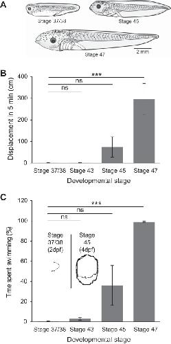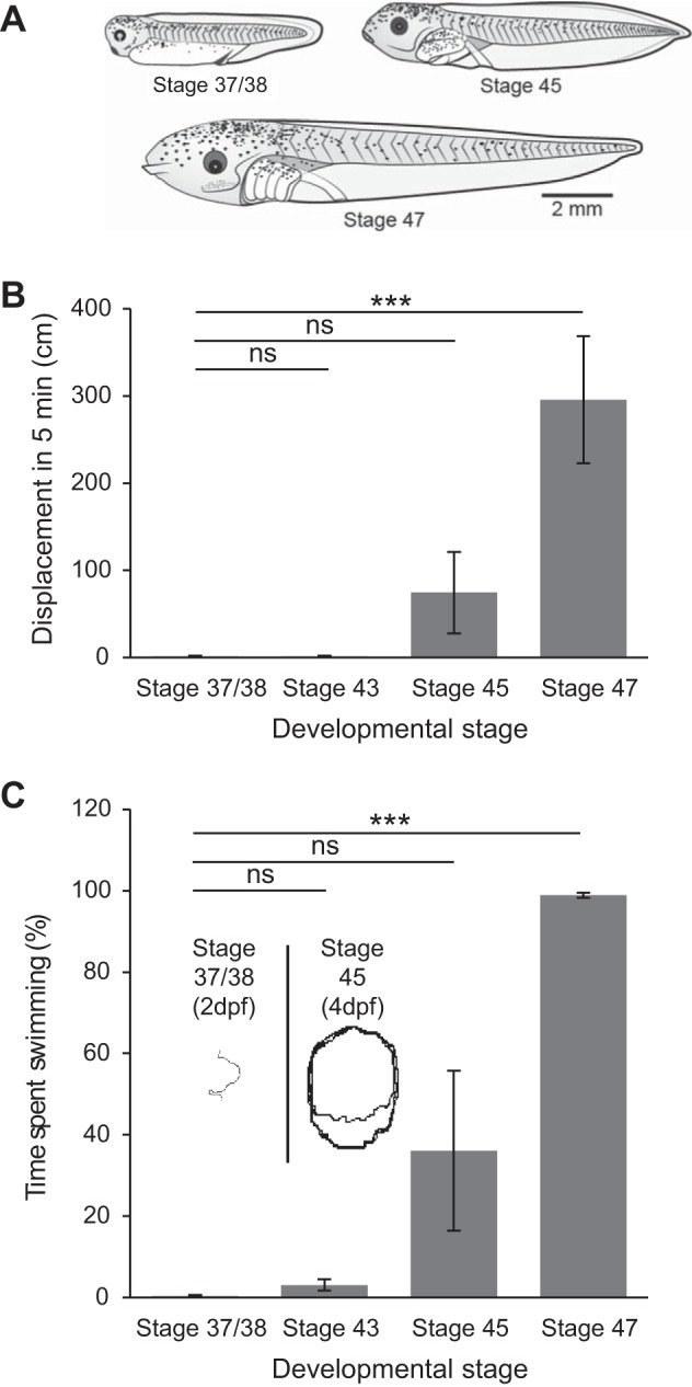 Fig. 1. Developmental increase in spontaneous swimming behavior. A: examples of postembryonic stage 37/38 and larval stages 45 and 47 Xenopus laevis tadpoles. Drawings kindly provided by Laurence D. Picton, with permission. B: bar graph of the displacement during swimming measured over a 5-min period at different larval stages. C: bar graph of percentage of total time spent swimming measured over 5 min at different larval stages. Insets show typical swim trajectories at stages 37/38 [2 days postfertilization (dpf)] and 45 (4 dpf). Values are means ± SE. ns, Nonsignificant. ***P < 0.001.