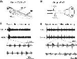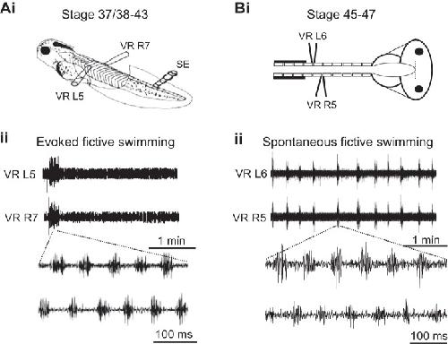 Fig. 2. Comparison of fictive swimming in Xenopus tadpoles at stages before and after onset of free feeding. Ai: preparation used at stages 37/38â44; schematic shows a stage 42 animal immobilized in α-bungarotoxin with locations of extracellular ventral root (VR) recording electrodes on left (L) and right (R) sides and a tail-skin stimulating electrode (SE). Aii: a single episode of fictive swimming evoked by a 1-ms electrical current pulse applied via the SE. Note that, after the end of the swim bout, the preparation remains silent in the absence of further stimulation. Below is an expanded excerpt during swimming activity highlighting L/R alternation of VR bursts. Bi: equivalent preparation at stage 45â47. Bii: in the absence of any extrinsic stimulation, the preparation spontaneously generates regular episodes of fictive swimming, here, every â¼20 s. Below is an expanded excerpt of swimming activity during the indicated episode again showing L/R VR burst alternation.