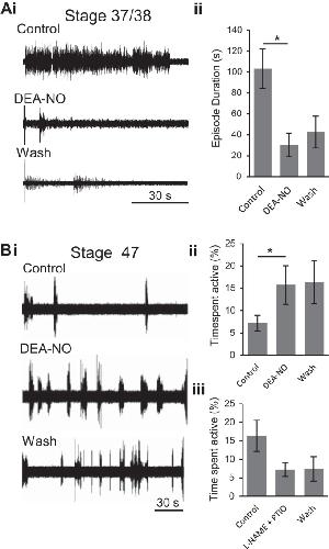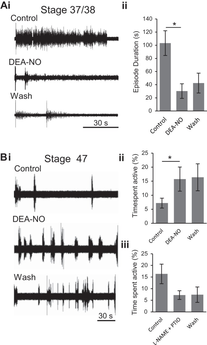Fig. 4. Developmental switch in nitric oxide (NO) modulation of fictive swimming in Xenopus tadpoles. Ai: extracellular recording (VR R5) from a stage 42tadpole (as in Fig. 2Ai) of evoked episodes of fictive swimming in control, in the presence of the NO donor diethylamine NONOate (DEA-NO; 200 μM) and during drug washout. Aii: pooled data depicting the mean ED in each condition (n = 9). Bi: extracellular record (VR R7) from a stage 47tadpole (as in Fig. 2Bi) of spontaneous fictive swimming occurring in control conditions and when it increased in the presence of DEA-NO (200 μM). Bii: pooled data showing mean percentage of time spent active in each condition (n = 5). Biii: pooled data showing the mean time spent active following co-application of the NOS inhibitor NÏ-nitro-l-arginine methyl ester (l-NAME; 1 mM) and the NO scavenger 2-phenyl-4,4,5,5-tetramethylimidazoline-1-oxyl 3-oxide (PTIO; 100 μM, n = 4). *P < 0.05.