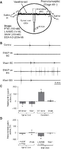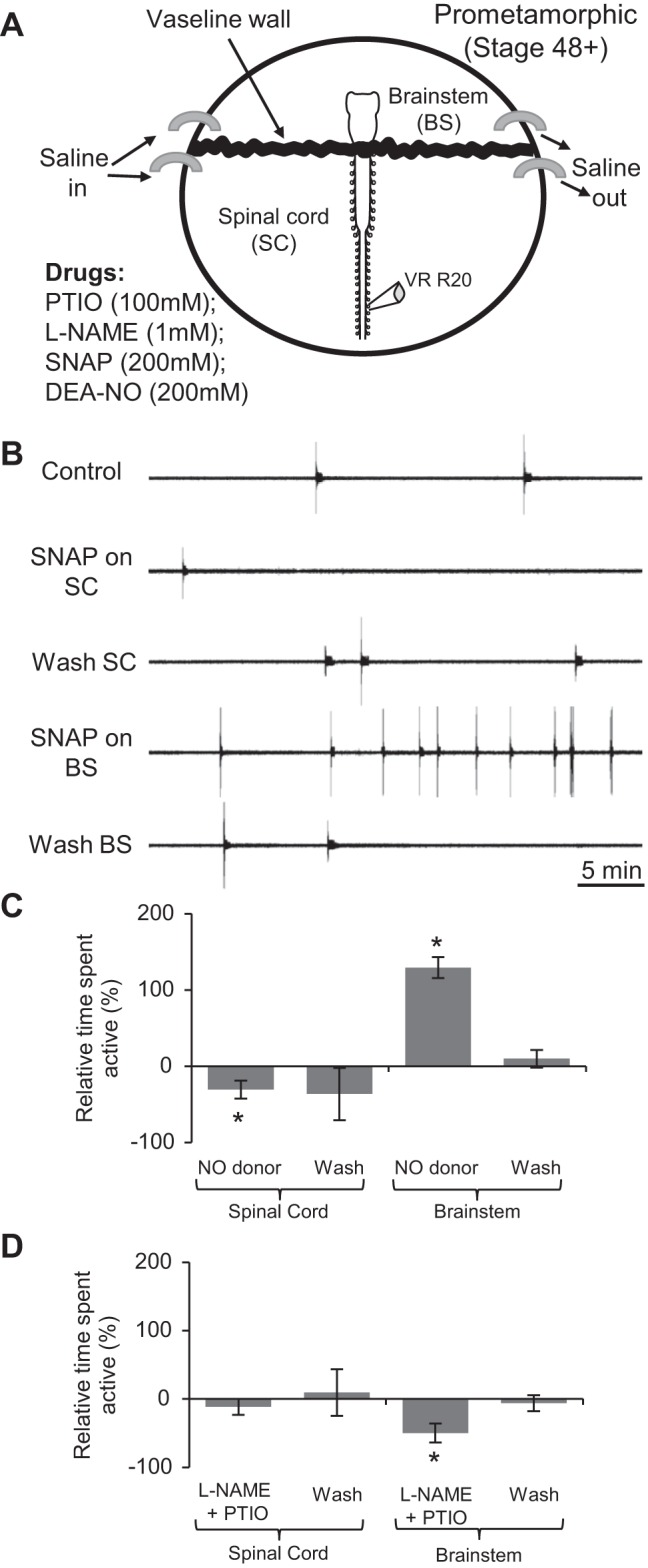 Fig. 7. NO's effects on fictive locomotor occurrence at pro-metamorphic stages are mediated in the brain stem (BS). A: schematic of the recording set up for split-bath experiments (adapted from Clemens et al. 2012). B: VR (VR R20) recording from a stage 54tadpole showing spontaneous locomotor activity expression during CNS region-specific application of the NO donor SNAP (200 μM). C: pooled data for the mean duration of locomotor activity relative to control (0%) during and after application of NO donors SNAP (200 μM) or DEA-NO (50â200 μM) to the spinal cord (SC) alone (left bar graphs) or the BS alone (right bar graphs) (n = 8). D: same pooled analyses as in C, but for the location-specific co-application of l-NAME and PTIO to either the SC (left; n = 6) or the BS (right; n = 5). Values are means ± SE. *P < 0.05.