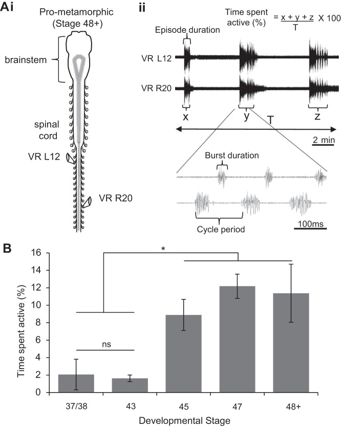 Fig. 3. Development of fictive swimming in later stage Xenopus tadpoles. Ai: completely isolated central nervous system (CNS) preparation at pro-metamorphic (48â62) larval stages with recording electrodes (at VR L12, R20). Aii: repetitive bouts of spontaneous fictive swimming. Shown below is an expanded excerpt of fictive swimming and method used to calculate the percentage of time spent active (see also at top). Other measured rhythm parameters within swim episodes, burst duration (BD), cycle period (CP) and episode duration (ED), are also indicated. B: bar graph illustrating the developmental increase in spontaneous fictive swim occurrence expressed as a mean percentage of time (over a 5-min period) that preparations were active. Values are means ± SE. *P < 0.05.
