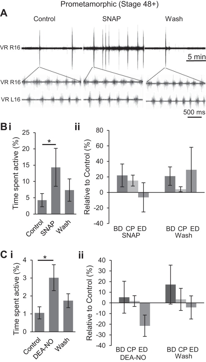 Fig. 5. NO donors increase the occurrence of spontaneous locomotor activity at pro-metamorphic stages. A: VR recording from a stage 54tadpole both prior to, and during, NO donor [S-nitroso-N-acetyl penicillamine (SNAP), 200 μM] application and then following washout with expanded excerpts of L/R alternating VR (L/R 16) bursting during fictive swimming in each condition. Bi: pooled data showing the mean percent time spent active in each condition (n = 13). Bii: pooled data from the same preparations [as illustrated in expanded excerpts in A showing mean BD, CP, and ED (see Fig. 3Aii)] relative to control values during and after SNAP application. C: same pooled data analyses as in B, but for application of a different NO donor, DEA-NO (50â200 μM; n = 14). Values are means ± SE. *P < 0.05.