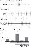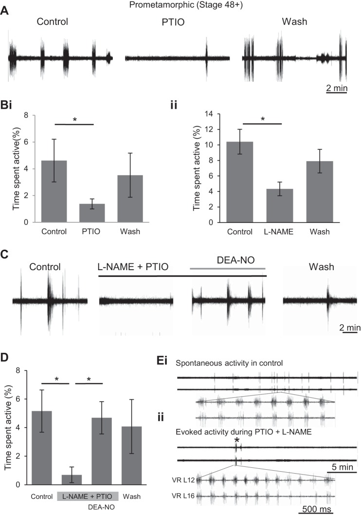 Fig. 6. Scavenging endogenous NO and inhibiting endogenous NO synthase (NOS) activity decreases fictive locomotion occurrence. A: VR recordings (VR L17) from a stage 55tadpole before, during bath application and following washout of the NO scavenger PTIO (50â200 μM). Bi: pooled data of the mean time spent active in control, under PTIO application and during washout (n = 10). Bii: pooled data of the mean percentage of time spent active before, during and after application of the NOS inhibitor l-NAME (1â2 mM; n = 6). C: VR recordings (VR R18) from a stage 55tadpole of locomotor activity following sequential applications of combined PTIO (100 μM) and l-NAME (1 mM), and then NO donor DEA-NO (200 μM). D: pooled data of the mean percentage of time spent active during the drug manipulations in C (n = 4). Values are means ± SE. *P < 0.05. E: during prolonged exposure to PTIO and l-NAME, spontaneous locomotor activity was generally completely abolished (c.f., top traces in Ei and Eii; also see C and D). However, the central pattern generator (CPG) network remained functional during this drug-induced silence since electrical stimulation of the optic tectum (* in Eii) could elicit episodes of rhythmic activity that were very similar from spontaneous fictive locomotion in control (c.f., bottom traces in Ei and Eii).