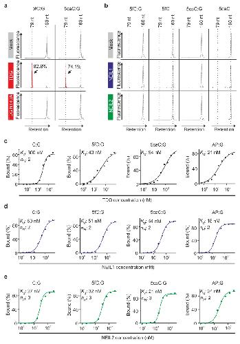 Figure 4. NEIL1 and NEIL2 do not process and bind 5fC and 5caC in vitro.(a,b) Electropherograms of reaction products from DNA glycosylase assays with 20 nM ds (5fC:G; 5caC:G) and ss (5fC; 5caC) oligonucleotide substrates. Recombinant DNA glycosylase was in 10-fold excess over oligonucleotide substrate (single turnover conditions). (a) Human TDG (reaction products highlighted in red with efficiencies shown in %) and catalytically inactive mutant TDGN140A. (b) Human NEIL1 and NEIL2. Data are representative of three independent experiments.(c-e) DNA binding assays with TDG, NEIL1 and NEIL2. Fitted curves, calculated dissociation constants (Kd) and Hill coefficients (nH) derived from electrophoretic mobility shift assays towards indicated ds oligonucleotides are shown. Binding assays are representative of two independent experiments with similar outcome. |