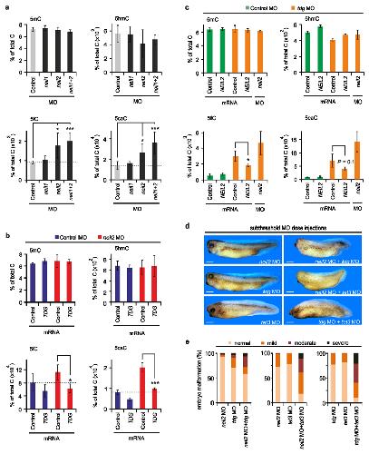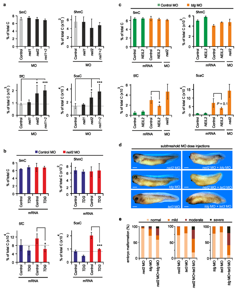 Figure 7. Neil2 is required for 5fC and 5caC removal in Xenopus embryos and cooperates with Tet3 and Tdg.(a) LC-MS/MS analysis of genomic 5mC, 5hmC, 5fC and 5caC levels in neil morphant animal cap explants at stage 32. Error bars, s.d. (n = 4 explant batches each consisting of 20 animal cap explants). Grey, controls; black, morphants.(b) LC-MS/MS analysis as in (a) with Control MO (blue) and neil2 MO (red) injected animal caps without or with co-injection of human TDG mRNA as indicated. Error bars, s.d. (n = 3 explant batches each consisting of 20 animal cap explants).(c) LC-MS/MS analysis as in (a), but in Control MO (green) and tdg MO (orange) injected animal caps (without or with co-injection of human NEIL2 mRNA and neil2 MO as indicated. Error bars, s.d. (n = 3 explant batches each consisting of 20 animal cap explants).(d) Functional cooperation of neil2, tdg and tet3 in X. laevis embryonic development. Subthreshold doses of neil2, tdg or tet3 morpholinos (10 ng/embryo) were singly injected with Control MO (10 ng/embryo; top) or in combination (bottom) as indicated, to keep total MO dose in all samples constant. Embryos were fixed at stage 34. Scale bars, 200 µm(e) Quantification of embryo malformations shown in d (n > 30 embryos per group, for details see source data).*P < 0.05, ***P < 0.005 by two-tailed unpaired Studentâs t-test. |