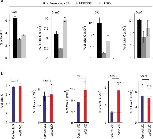 Supplementary Figure 7 Relative abundance of X. laevis genomic DNA modifications. (a) Quantification of total genomic 5mC, 5hmC, 5fC and 5caC levels in X. laevis whole embryos at stage 32, human HEK293T cells and mouse ES cells (mESCs) by LC-MS/MS. Error bars, s.d. (n = 3 X. laevis embryo batches consisting each of at least 5 embryos and 3 cell cultures of HEK293T and mESCs, respectively). (b) LC-MS/MS quantification as in (a) but in control and neil2 morphant Xenopus animal cap explants including measurements of 8oxoG. Error bars, s.d. (n = 3 explant batches each consisting of 20 animal cap explants). n.s., not significant. *P < 0.05, ***P < 0.005 by two-tailed unpaired Student’s t-test. |