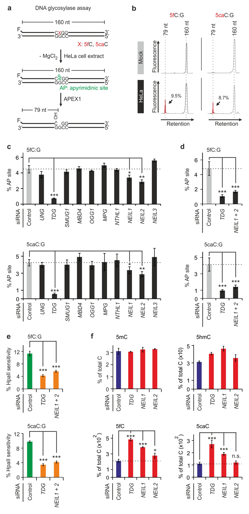 Figure 2. NEIL1 and NEIL2 are required for removal of 5fC and 5caC in HeLa cells.(a) Scheme of DNA glycosylase assay. A 160 bp synthetic, fluorescently-labeled oligonucleotide containing the indicated cytosine derivative was incubated for N-glycosidic bond cleavage by HeLa extract DNA glycosylases in absence of MgCl2. Base excision generates an abasic site, which can be converted into a single-strand break (nucleotide position 79) by recombinant APEX1, and monitored by denaturing PAGE.(b) Electropherograms of DNA glycosylase assays. Product peaks of glycosylase activities (79mers; arrows) are highlighted red with efficiencies shown as % of 79 nt peak integral relative to the total fluorescent signal per electropherogram. Data are representative of three independent experiments.(c) siRNA screen for DNA glycosylases required for 5fC and 5caC removal. Data represent percentage of abasic sites (% AP site) generated during the assay as quantified from strand cleavage products (79mer) post APEX1 treatment.(d) DNA glycosylase assay using HeLa extracts depleted of TDG and NEIL1 + NEIL2 by siRNAs.(e) DNA demodification assay as in Figure 1 b but with HeLa cell extracts depleted as in d.(f) LC-MS/MS quantification of genomic cytosine modifications from HeLa cells siRNA depleted of the indicated genes. Cells were transfected with TET1 catalytic domain to elevate levels of rare demethylation intermediates and to facilitate their mass-spectrometric detection.Error bars, s.d. (n = 3 assay repetitions (c-e) or cell culture transfections (f)). n.s., not significant. *P < 0.05, **P < 0.01, ***P < 0.005 by two-tailed unpaired Studentâs t-test. |