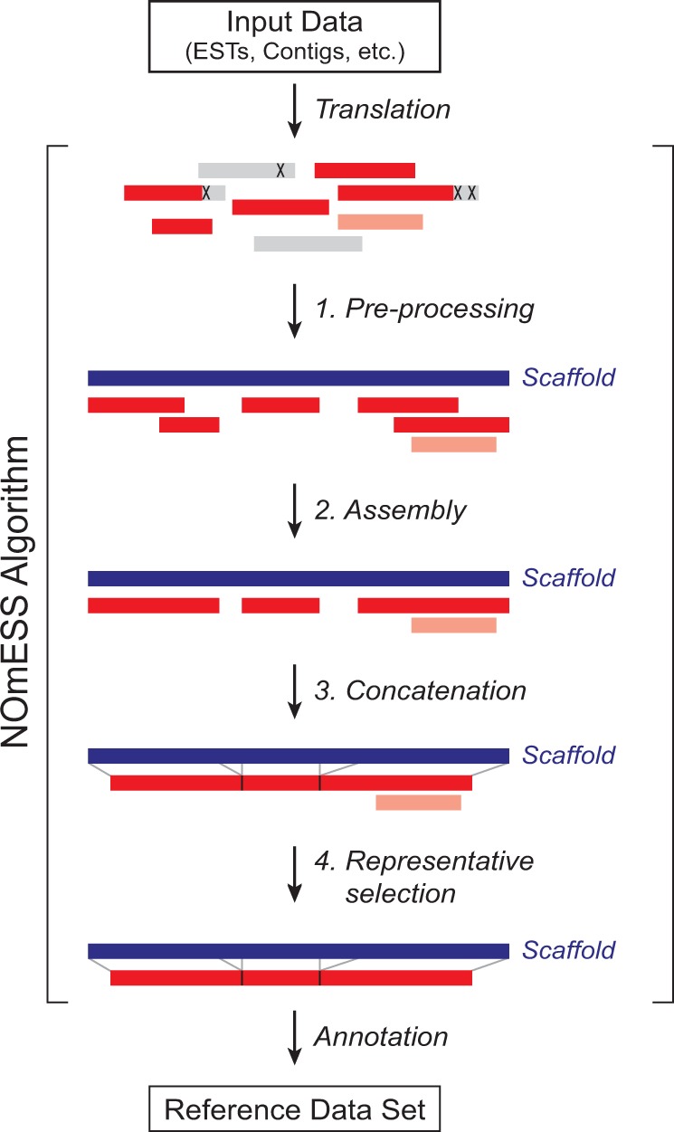 UNLABELLED: To enable mass spectrometry (MS)-based proteomic studies with poorly characterized organisms, we developed a computational workflow for the homology-driven assembly of a non-redundant reference sequence dataset. In the automated pipeline, translated DNA sequences (e.g. ESTs, RNA deep-sequencing data) are aligned to those of a closely related and fully sequenced organism. Representative sequences are derived from each cluster and joined, resulting in a non-redundant reference set representing the maximal available amino acid sequence information for each protein. We here applied NOmESS to assemble a reference database for the widely used model organism Xenopus laevis and demonstrate its use in proteomic applications. AVAILABILITY AND IMPLEMENTATION: NOmESS is written in C#. The source code as well as the executables can be downloaded from http://www.biochem.mpg.de/cox Execution of NOmESS requires BLASTp and cd-hit in addition. CONTACT: cox@biochem.mpg.de SUPPLEMENTARY INFORMATION: Supplementary data are available at Bioinformatics online.