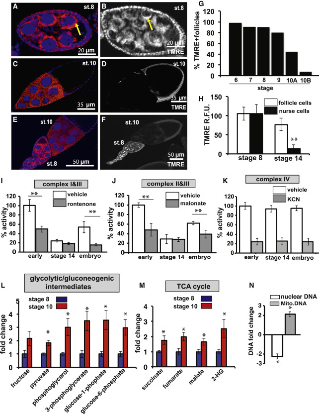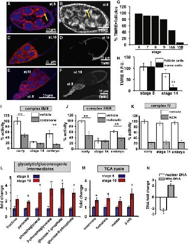 Figure 2. Mitochondria Enter a Low-Energy State of Respiratory Quiescence to Promote Glycogen Storage in Late Oogenesis(A, C, and E) Ovaries from Oregon R females fixed and stained with ATP5a antibodies (red) and DAPI (blue).(B, D, and F) Ovaries from Oregon R females were stained with the mitochondrial membrane potential stain TMRE.(G) Stage-specific quantification of the % of TMRE-nurse cells from wild-type ovarioles.(H) Quantification of TMRE fluorescence from stage 8 and stage 14 follicle cells and nurse cells.(I) Complex I and III compound activity from early follicles, stage 14 oocytes, and 12- to 16-hr embryos.(J) Complex II and III compound activity from early follicles, stage 14 oocytes, and 12- to 16-hr embryos.(K) Complex II and III compound activity from early follicles, stage 14 oocytes, and 12- to 16-hr embryos.(L and M) GC/MS measurements of glycolytic (M) and TCA cycle (N) intermediates from stage 8 and stage 10 follicles.(N) qPCR quantification of relative nuclear and mitochondrial DNA content from stage 10 follicles and stage 14 oocytes.Error bars represent SD. âp < 0.05; ââp < 0.005. |