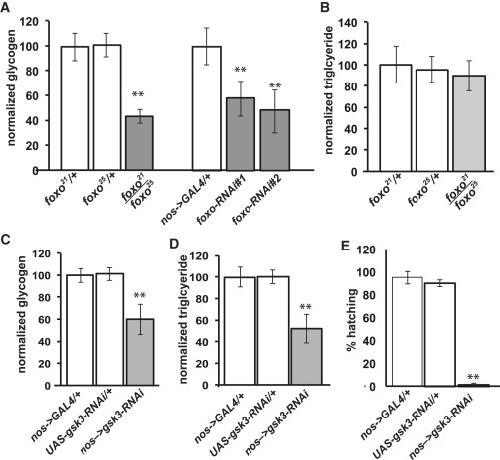 Figure 5. Akt Target Genes Are Required for Glycogen Storage in Stage 14 Oocytes(A) Glycogen levels were measured by colorimetric assay and normalized to total protein from the indicated genotypes. The results are displayed as a percentage of the wild-type control of each experiment.(B) Colorimetric triglyceride measurements of stage 14 oocytes from foxo21/foxo25 mutant females.(C and D) Glycogen (C) and triglyceride (D) levels were measured by colorimetric assay and normalized to total protein from nos-GAL4/+, UAS-gsk3-RNAi/+, and nosâgsk3-RNAi stage 14 oocytes.(E) Percent hatching of embryos from nos-GAL4/+, UAS-gsk3-RNAi/+, and nosâgsk3-RNAi stage 14 females.Error bars represent 1à SD. âp < 0.05; ââp < 0.005. |