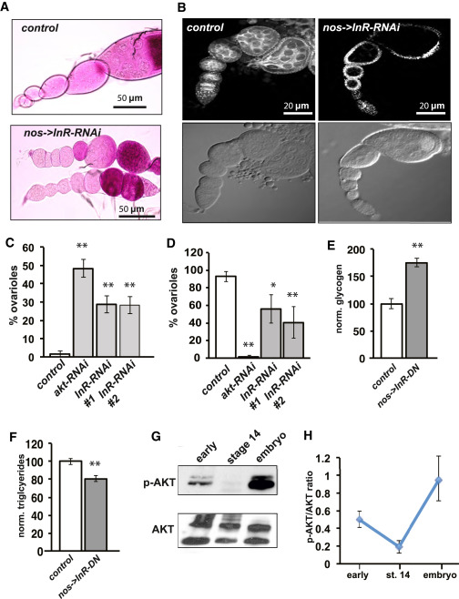Figure 4. Insulin Regulates the Timing of Glycogen Accumulation and Mitochondrial Depolarization(A) Periodic acid Schiffâs staining (glycogen) of nos-GAL4/+ control and nos->InR-RNAi ovarioles.(B) TMRE staining and DIC images (below) of nos-GAL4/+ control and nos->InR-RNAi ovarioles.(C) Depicts the percentage of ovarioles that display premature glycogen accumulation from nos-GAL4/+ control, nosâAkt-RNA, nosâInR-RNA#1, and nosâInR-RNA#2 females.(D) Depicts the percentage of ovarioles that display a high level of mitochondrial membrane potential from nos-GAL4/+ control, nosâAkt-RNA, nosâInR-RNA#1, and nosâInR-RNA#2 females.(E) Normalized glycogen levels measured by colorimetric assay from nos-GAL4/+ control and nosâInR-DN stage 14 oocytes.(F) Normalized triglyceride levels measured by colorimetric assay from nos-GAL4/+ control and nosâInR-DN stage 14 oocytes.(G) p-AKT and AKT westerns from early-stage follicles, stage 14 oocytes, and 12- to 16-hr embryo samples.(H) Quantification of p-AKT/AKT ratios from early-stage follicles, stage 14 oocytes, and embryos.Error bars represent SD. âp < 0.05; ââp < 0.005. |