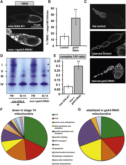 Figure 6. GSK3 Promotes Mitochondria Respiratory Quiescence(A) TMRE staining and DIC images of nos-GAL4/+ control and nosâGSK3-RNAi stage 10B follicles.(B) Quantification the percentage of stage 10B follicles that exhibit high nurse cell mitochondrial membrane potential in control and gsk3-RNAI follicles.(C) Mitochondrial membrane potential staining (TMRE) from control fed, control starved, and gsk3-RNAi starved ovarioles.(D) Blue native PAGE of mitochondria from nos-GAL4/+ and nosâgsk3-RNAi stage 14 oocytes and dissected flight muscle (FM).(E) Quantification of the ratio of complex I to complex IV from nos-GAL4/+ and nosâgsk3-RNAi stage 14 oocytes.(F) Venn diagram of processes involving proteins found to be decreased in mitochondria from stage 14 oocytes. Each process is shown proportional to the number of affected proteins.(G) Venn diagram of processes involving proteins found to be stabilized in mitochondria from stage 14 GSK3-RNAi oocytes presented as in F.Error bars represent SD. âp < 0.05; ââp < 0.005. |