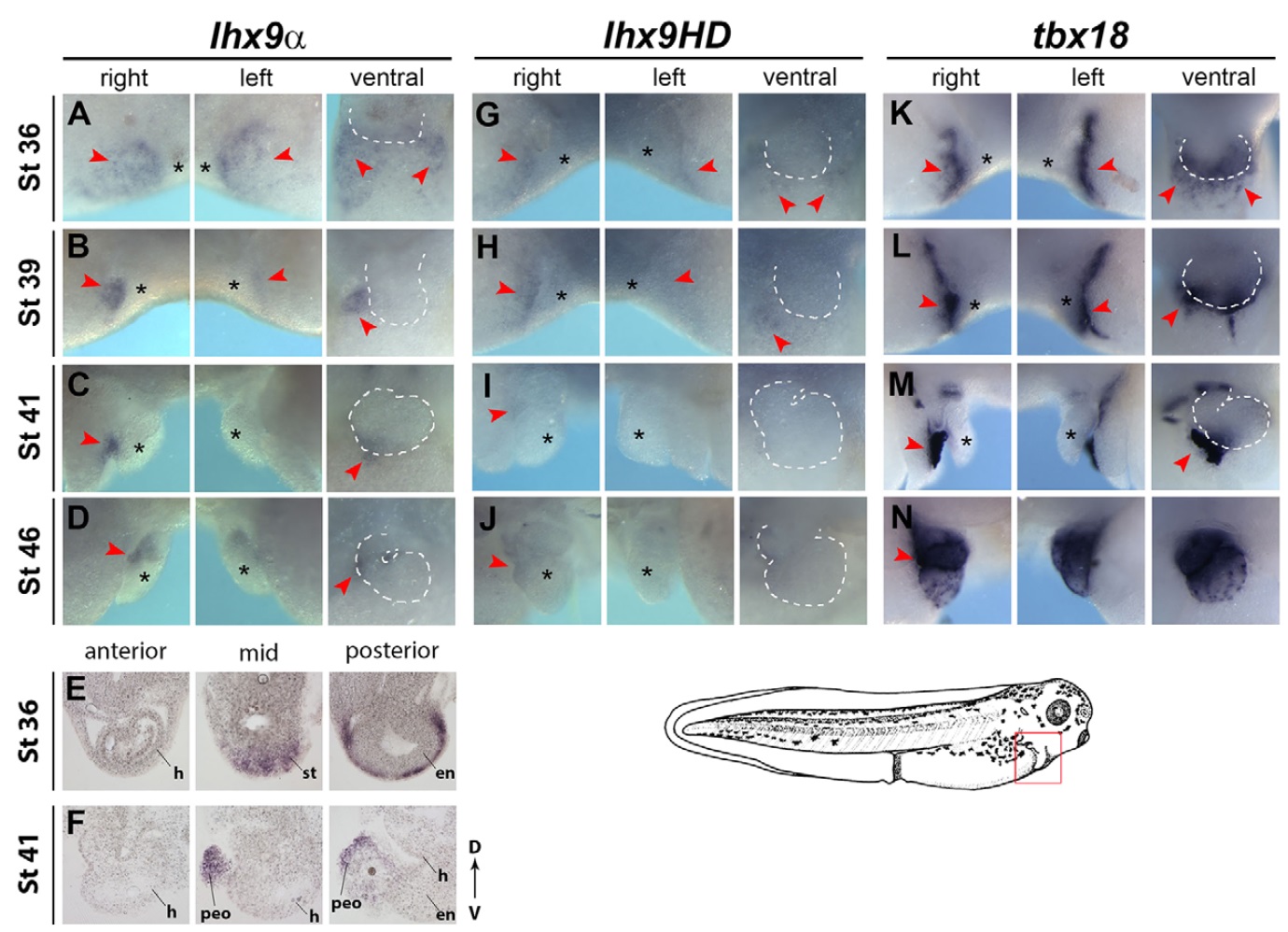 Fig. 1. Spatio-temporal analysis of lhx9 isoforms during Xenopus epicardial development. Whole embryo in situ hybridization was performed on Xenopus embryos at stages 36 to 46, using probes specific for lhx9-α (A-D), lhx9-LIM (E,F), lhx9-HD (G-L) and tbx18 (K-N) (see also Figs S2-S5). Views display embryos facing right, left and ventral with anterior to the top. Images show magnified cardiac regions as depicted by red box on tadpole schematic (bottom right). Red arrowheads indicate staining of septum transversum and PE clusters. Asterisks indicate cardiac region. White dashed line outlines heart in ventral views. (E,F) Transverse gelatin section in situ hybridization images of cardiac region demonstrate lhx9-LIM expression exclusively in the septum transversum (stage 36) and proepicardial tissue (stage 41). en, anterior endoderm; h, heart; peo, proepicardial organ; st, septum transversum. |
