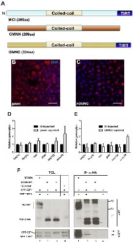 (D and E) Quantitative qPCRs were performed on zebrafish gmnc-HA (D) or human GMNC-HA (E) RNA-injected embryos at 24
