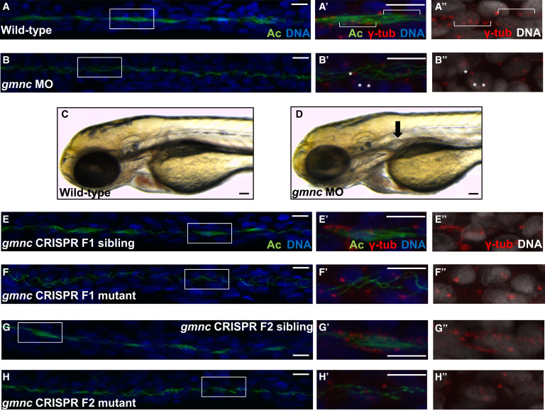 Figure 1. Gmnc Is Required for MCC Formation in the Kidney Tubules of the Zebrafish Embryo(A and B) The kidney tubules of 48 hr post-fertilization (hpf) wild-type embryos are populated with clusters of MCCs (A). Boxes delineate the regions imaged at a higher magnification in (Aâ²) and (Aâ²). Multiple basal bodies are indicated by brackets (Aâ² and Aâ²). In contrast, 100% (n = 47, from two independent experiments) of the gmnc splice-blocking MO-injected embryos were devoid of MCCs (B and Bâ²). Examples of single basal bodies are marked by asterisks (Bâ² and Bâ²). Acetylated-tubulin (Ac; green), DAPI (DNA; blue; rendered in black and white in Aâ² and Bâ²), and γ-tubulin (marks basal bodies; red; for Aâ², Aâ², Bâ², and Bâ² only).(C and D) In contrast to wild-type embryos (C), kidney cysts (black arrow) form in 3-day-old gmnc morphants (93%, n = 40) (D).(E and F) The F1 generation from intercrossed F0 gmnc CRISPR mutants was a mixture of wild-type animals (E) and animals carrying the gmnc deletion (F). The kidney tubules of the latter did not harbor MCCs at 36 hpf.(G and H) Approximately one-quarter (two different pairs of F1 heterozygotes were analyzed; pair 1: 26%, n = 31; pair 2: 27%, n = 44) of the F2 generation from intercrossed heterozygous F1 parents lacked MCCs in the kidney tubules at 36 hpf (H). The other three-quarters of the embryos appeared wild-type (G).Scale bars, 10 μm (C and D); 5 μm (all others). See also Figure S1.