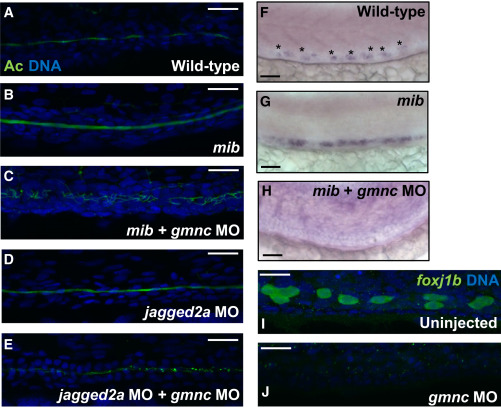 Figure 2. Gmnc Functions Downstream of Notch Activation and Upstream of mcidas(AâC) At 48 hpf, the kidney tubules of mib mutant embryos display supernumerary MCCs, which appear as a contiguous bundle (B), in contrast to wild-type embryos, whose kidney tubules harbor distinct clusters of MCCs (A). A majority of the mib embryos injected with the gmnc MO were devoid of MCCs (75%; n = 10) (C), replicating the phenotype of the gmnc morphants ( Figure 1B). Acetylated-tubulin, green; DAPI, blue.(D and E) Similar to the mib mutants (B), jagged2a morphants at 48 hpf harbor supernumerary MCCs lining the kidney tubules (D). Embryos co-injected with jagged2a and gmnc MOs exhibited the gmnc morphant phenotype and lacked MCCs (100%; n = 10) (E).(FâH) At 24 hpf, the zebrafish mcidas gene is expressed in the kidney tubules in a spotted pattern (asterisks) that corresponds to the MCC precursors (F). mcidas expression domain is expanded in mib mutant embryos (G) and is completely lost when gmnc is knocked down in the mib background (100%; n = 20) (H).(I and J) The Tg(foxj1b::GFP) reporter fish strain (T2BGSZ10) reveals that, at 24 hpf, foxj1b is expressed in the MCC precursor cells of the kidneyducts (I). foxj1b::GFP expression was lost in the gmnc MO-injected T2BGSZ10 embryos (100%; n = 16) (J). GFP (foxj1b), green; DAPI, blue.Scale bars, 50 μm (FâH); 10 μm (all others). See also Figure S2.
