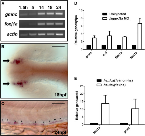 Figure 3. gmnc Is Expressed in the Kidney Tubules and Is Modulated by Notch Signaling and Foxj1a Activation(A) End-point PCRs on cDNA extracted from 1.5, 5, 14, 18, and 24 hpf embryos, respectively, revealed that whereas the maternal contribution of the foxj1a transcript is minimal (1.5 hr), the gmnc transcript is maternally deposited. actin-b1 (actb1) was used as the loading control.(B and C) Representative staining from in situ hybridization using a probe against gmnc showed that the gene is expressed in the developing nasal placodes (arrows) at 18 hpf (B) and is also expressed in a spotted pattern in the mid-section of the kidneyducts (asterisks) at 24 hpf (C). Scale bars, 50 μm.(D) qPCRs were performed on uninjected or jagged2a MO-injected embryos at 24 hpf. Similar to the ciliogenic genes like foxj1a, foxj1b, and mcidas (mci), whose levels increased in the N-deficient background, gmnc transcript levels also increased moderately (by â¼3-fold). Expression levels in the uninjected condition were arbitrarily assigned a value of 1. rplpo was used as an internal (loading) control. Error bars represent the SEM from two independent experiments.(E) qPCRs were performed on non-heat-shocked or heat-shocked Tg(hsp70::foxj1a) embryos. The heat-shock treatment induced the foxj1a transgene level by â¼15-fold, and the foxj1a overexpression induced the gmnc level by â¼10-fold. Expression levels in the non-heat-shocked condition were arbitrarily assigned a value of 1. actin-b1 (actb1) was used as an internal (loading) control. Error bars represent the SEM from three independent experiments.