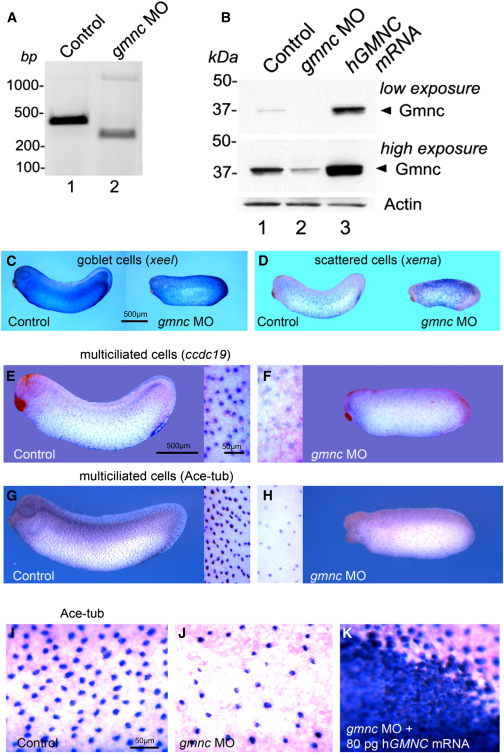 Figure 4. gmnc Is Necessary and Sufficient for MCC Differentiation in Xenopus(A) End-point PCRs on stage-30 control and gmnc morphants showed mis-splicing of the Xenopus gmnc pre-mRNA.(B) Western-blot analysis using an antibody against human GMNC showed that endogenous Gmnc was depleted in the gmnc morphant embryos at stage 35 and that the injected human GMNC RNA translated to a large amount of the GMNC protein. Actin was used as a loading control.(C and D) The development of gmnc morphant embryos was delayed (observed in 93% of the 43 animals tested). Despite this, in situ hybridization revealed no overt defects in the mucus-secreting goblet cell differentiation (81%; n = 21) (C) or in the differentiation of scattered cells, which are involved in ionic homeostasis regulation (78%; n = 18) (D).(E and F) In contrast to the lack of differentiation defects in goblet cells and scattered cells, the differentiation of MCCs, the third main cell type present on the Xenopus embryonic skin, and marked by ccdc19 (encoding a ciliary protein), was significantly reduced in the gmnc morphants (87%; n = 52) (F) compared to control embryos (E).(G and H) Immuno-staining of acetylated-tubulin revealed that multiple cilia were markedly reduced in the gmnc morphants (94%; n = 34) (H) compared to control embryos (G).(IâK) High-magnification images of the surface ectoderm at stage 30 in control (I), gmnc morphants (J), or emrbyos co-injected with gmnc MO and 80 pg of human GMNC RNA (K) showed that overexpression of the hGMNC RNA not only rescued the MCC defects in the gmnc morphants but was sufficient to produce ectopic MCCs (79%; n = 14).See also Figure S4.