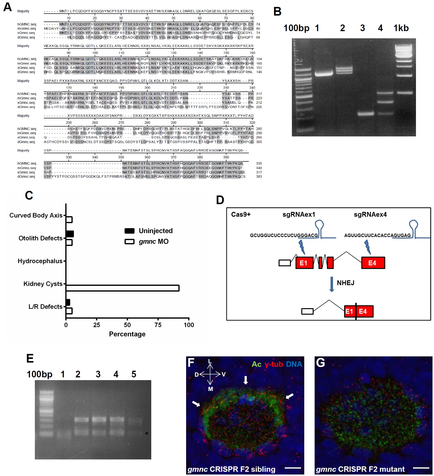 (D and E) Schematic showing the CRIPSR/Cas9-mediated genome modification at the zebrafish gmnc locus designed to excise a