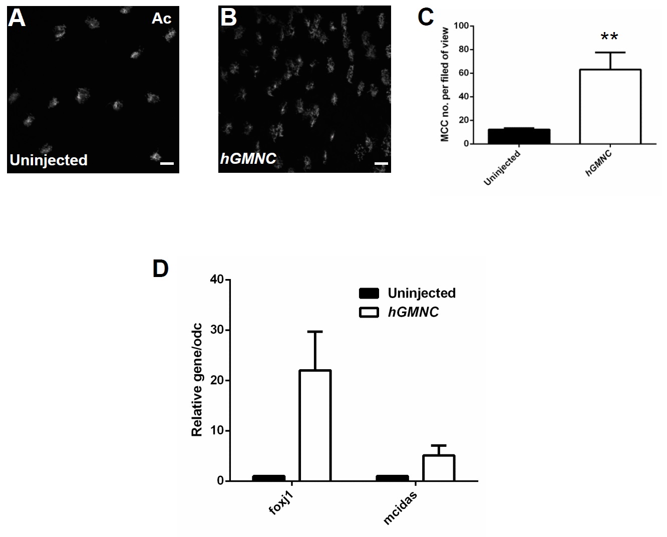 (D) Quantitative qPCRs were performed on uninjected or 80pg human GMNC RNA-injected (hGMNC) embryos. hGMNC