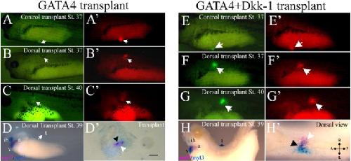 Fig. 6. Dorsal GATA4-expressing transplants show a Dkk-1 sensitive delay of cardiogenesis. (A, Aâ²) Control transplants of GATA4-injected reaggregates (CAG-GFP) showed cardiac differentiation by GFP expression at stage 37 as indicated by the arrows. (B, Bâ²) In contrast, transplants placed in the dorsal side of the host (position 6 in Fig. 5A) were negative for GFP expression at stage 37 (100%; n = 20), but 50% were positive after stage 39 (C, Câ²). No beating activity was detected in these reaggregates. (D, Dâ²) Double-WMISH showed that 20% (n = 94) of dorsal transplants express myl7 alone (white arrowhead) and only a small group of cells express both myl7 and myl3 (black arrowhead). (EâFâ²) Both control and dorsal transplants of reaggregates (CAG-GFP) co-injected with GATA4 and Dkk-1 showed evidence of cardiac differentiation (GFP activity) at stage 37. (G, Gâ²) Cardiac expression is maintained in dorsal transplants at stage 40. Beating activity was never detected in dorsal transplants. (H, Hâ²) Double WMISH shows overlapping expression between myl7 and myl3 (black arrowhead) and regions of myl7 expression alone (white arrowhead) in 35% of dorsal transplants (n = 84; the remaining transplants were negative for cardiac gene expression). a, atrium; ih, interhyoid muscle of the jaw; t, transplant; v, ventricle. The scale bar corresponds to 100 μm. |