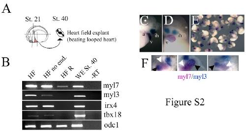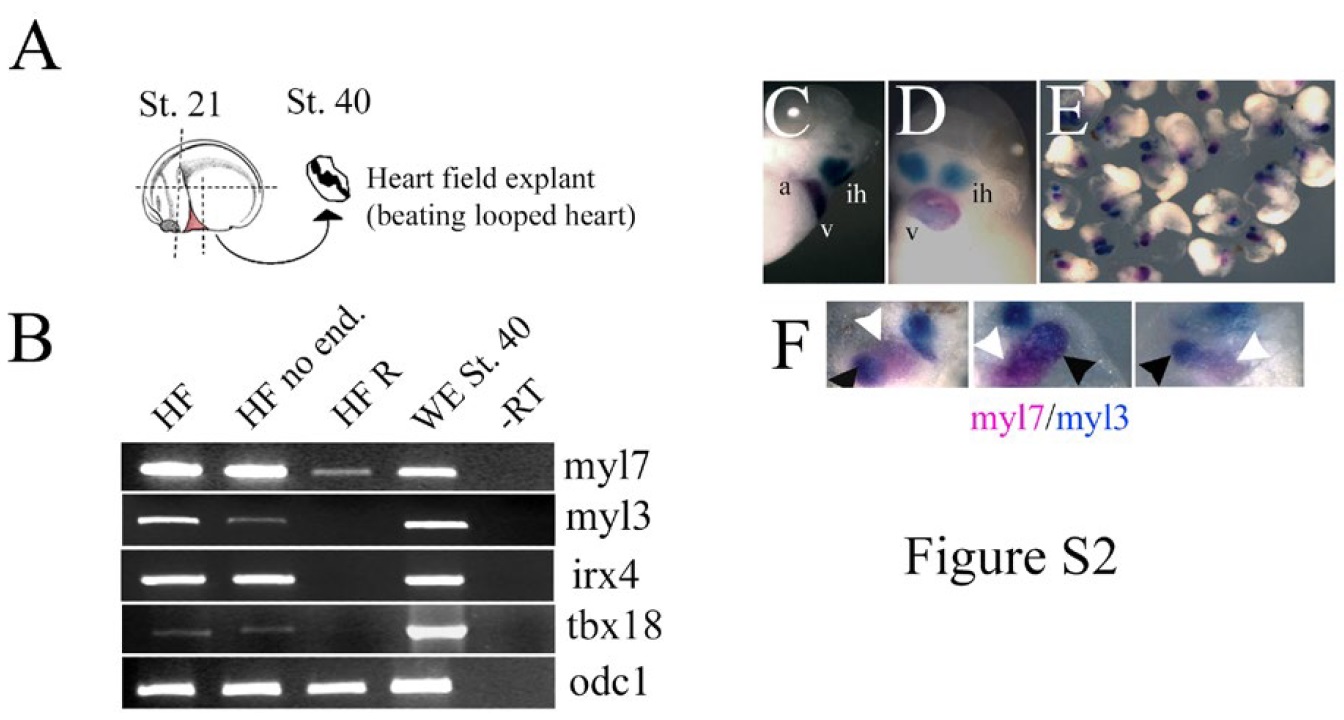 Figure S2. Cardiac cell fate diversification requires intact heart fields. (A) Diagram of the experiment. Heart Fields (HF) were explanted at stage 20 and were analysed at stage 40. (B) Dissociated and reaggregated HFs do not express ventricular and proepicardial markers, which are expressed by intact HF explants as well as by HFs from which endoderm was removed. RT-PCR analysis was performed for indicated markers. Double-WMISH analysis showing regions of overlapping expression between myl7 and myl3 in (C, D) control sibling embryos at stage 39 (C- lateral view, D- ventral view) and in HF explants (E,F). (E) All HF analysed express myl7 and myl3. (F) close up of 3 HF explants showing areas corresponding to the ventricle (myl7+/myl3+; black arrowheads) and myl7+/myl3- (white arrowheads). a- atria, ih- interhyoid muscles of the jaw, v- ventricle, HF R; heart field dissociated and reaggregated, WE; whole embryos. |